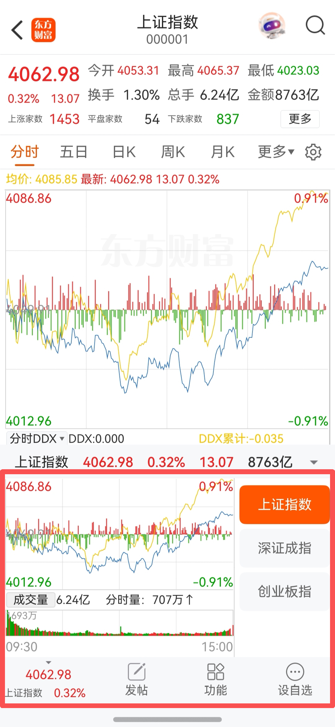 点击个股页面左下角指数区域,可快速在不同指数间切换,灵活掌握大盘动向。