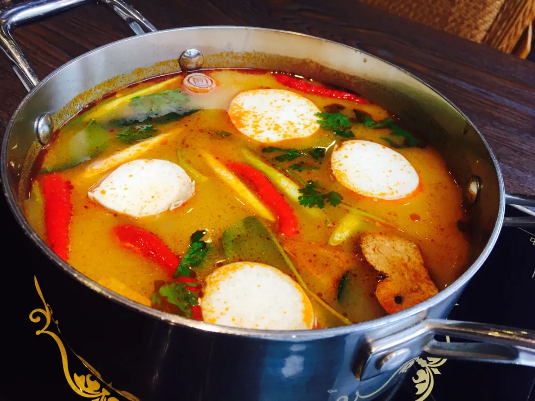 泰式陶锅在明火上发出滋滋声响,香茅段和南姜片在热油里绽放第一重香气,柠檬叶的芬芳接着到来。当棕榈糖与鱼露悄悄融入,青柠汁的酸和朝天椒的辣就开始共舞,这时候慢慢倒入椰浆,乳白与金黄交融成琥珀色的汤底,好似绸缎般柔滑。鲜活的河虾下锅刹那,虾壳从青变成红,尾部微微卷曲,仿佛在金汤中跳着最后的芭蕾。而且这般场景,尽显泰式料理的独特韵味。