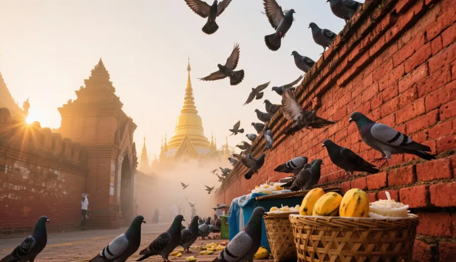 晨光里塔佩门那红色的砖墙透着暖色调,成群灰鸽扑棱着翅膀飞过墙头。散落的竹篮中,芒果糯米饭的椰香竟与空气中飘荡的香茅气息缠绵交织着。且看那一番景象,红墙暖光,灰鸽掠墙,椰香与香茅气息交织,尽显独特韵味。