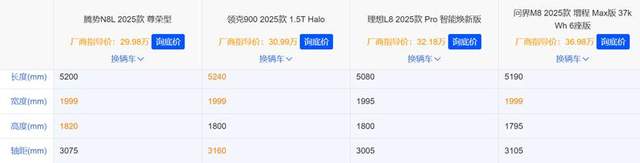 相对于同级竞品,车身长度基本都在5.2米左右、轴距3.1米左右。(理想L8尺寸最小,但因为尺寸接近的L9价格不在一个级别,所以我们选择价格接近的L8来对比。)但是价格上,相比腾势N8L,问界M8贵了7万块、理想L8贵了2.2万、领克900贵了1万左右。