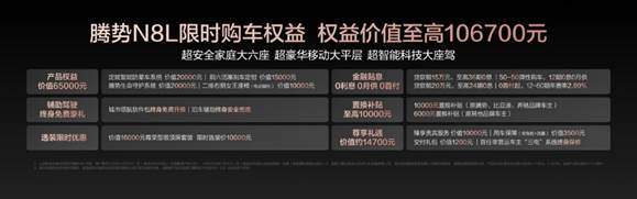 而且腾势N8L还有一系列的限时购车权益,比如价值1.7万元的三年免息,最高1万元的置换补贴。此外,在2025年11月30日24点前完成合同签署的用户,如果因非用户原因车辆未及时交付,导致开票实际发生在2026年,可享受最高1.5万元的购置税差额补贴。