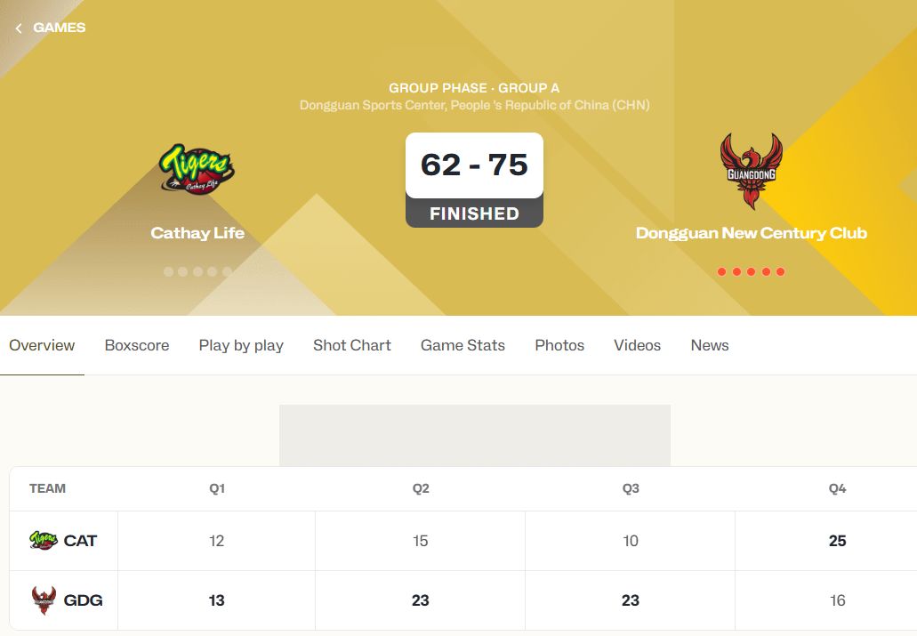 【2】广东女篮(中国)75-62国泰人寿(中国台北):首节两队打的有来有回,比分为13-12,第二节东莞女啦开始连续得分,以23-15建立优势,半场领先9分;第三节东莞手感火热得到23分,限制对手只拿到10分,分差来到22分;第四节广东轮换替补,对手趁机连续追分,单节比分为16-25输了9分,最终顺利以75-62拿下比赛。