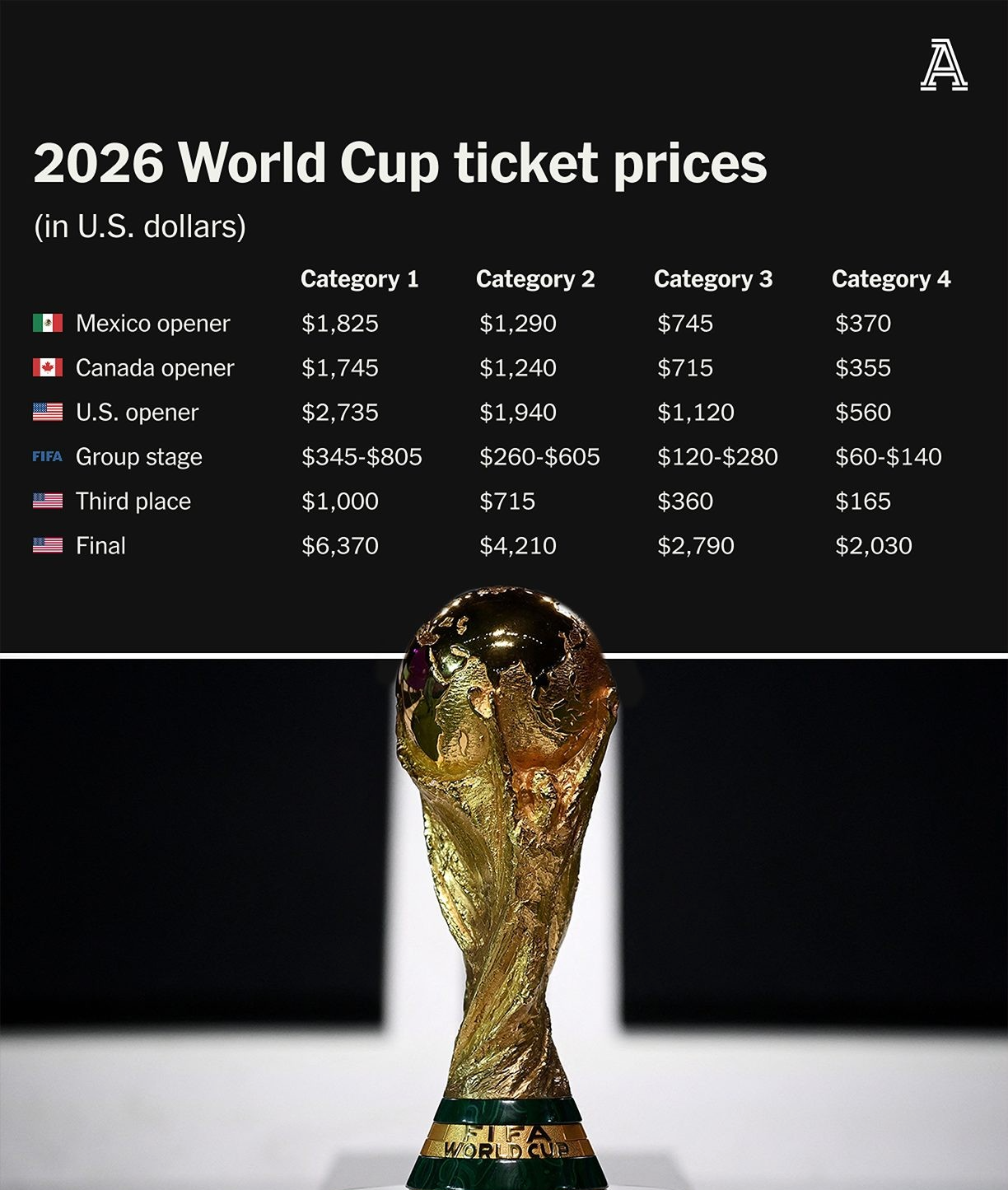 来自于The Athletic的报道显示,美加墨世界杯的门票价格如今已有了最新的定价标准: