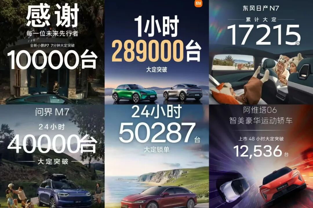 以近期新近上市的车型为例,售价24.98万起的理想i6仅5分钟就实现大定破万。鸿蒙智行旗下的全新问界M7上市,5分钟大定破1万台,1小时破3万台,24小时达4万台。吉利银河旗下旗舰插混大六座SUV银河M9,上市24小时大定破2.3万台。限时售价45.59万起的极氪9X也创造了上市13分钟大定订单破万的成绩。蔚来旗舰SUV全新ES8上市,售价40.68万起,baas租电29.88万起,更是在发布36小时后实现大定数量超5万辆的成绩。
