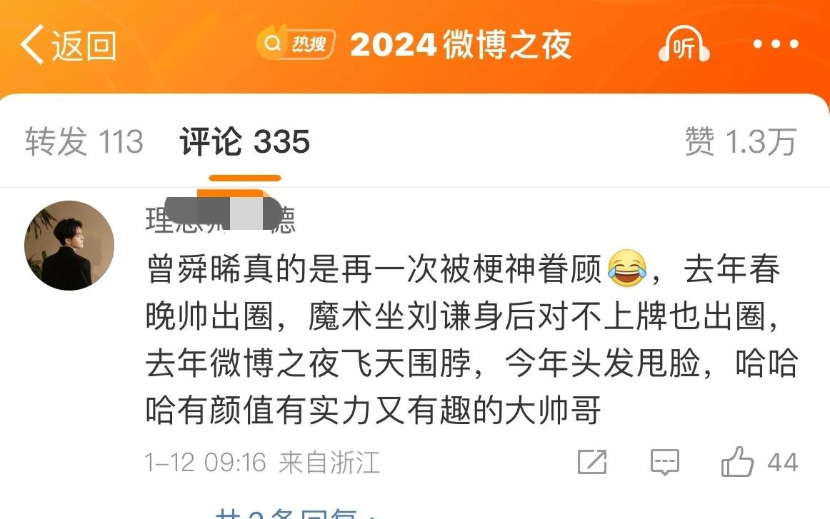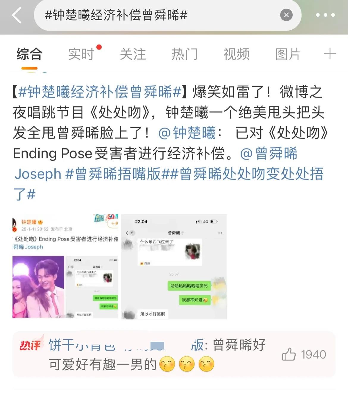 哎,你听说微博之夜那事儿了吗?钟楚曦和曾舜晞合作唱《处处吻》,结果……哈哈,真是笑死个人! 这俩人表演得正嗨,唱到最后,钟楚曦来了个大招——华丽丽的甩头发! 没想到啊没想到,这头发直接糊曾舜晞一脸!