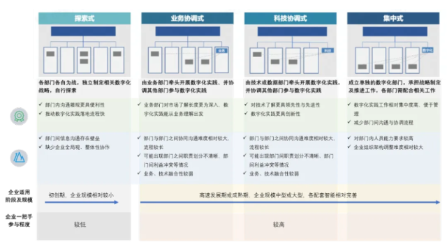 探索式是指各部门各自为战,独立定制相关数字化战略,自行探索。优点是部门内部沟通便利,实践落地流程比较快,缺点是部门之间的沟通是存在壁垒的,同时也缺少企业的全局观和整体协作,探索式比较适合初创期或者企业规模相对较小的企业。