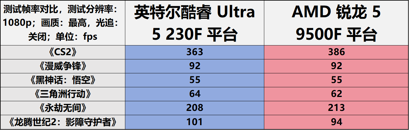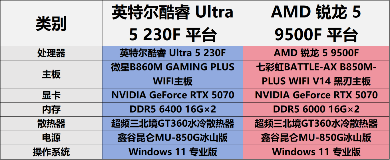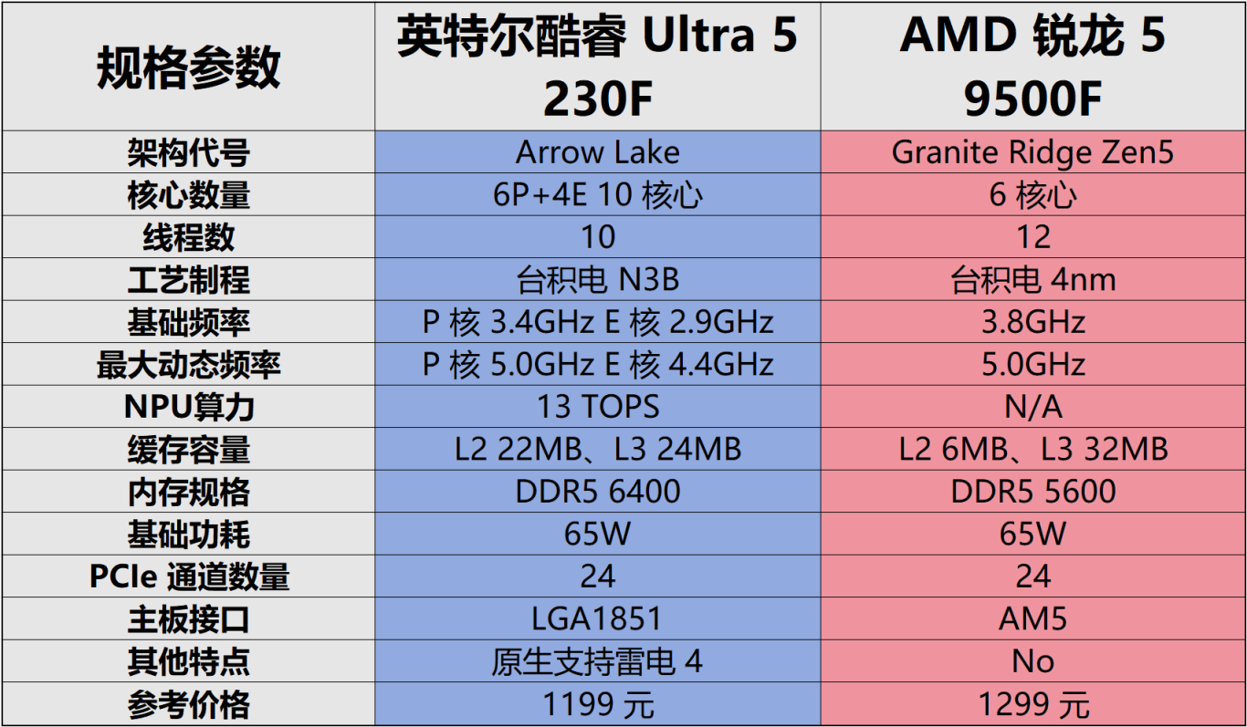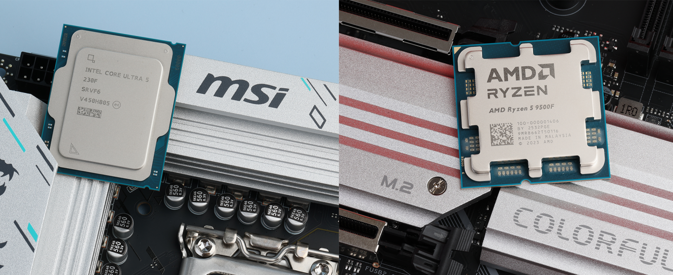 在消费级处理器市场中,受众基数庞大的千元级细分领域,因承接主流用户对性能与成本的平衡需求,始终是AMD与英特尔两大头部厂商竞争最为激烈的核心战场之一。该价位段产品不仅需满足日常应用场景,更要在游戏、轻度生产力等需求中展现适配能力,其市场表现对厂商整体用户覆盖至关重要。2025年初,英特尔率先针对中国市场推出特供版处理器酷睿Ultra 5 230F,精准切入千元级市场,试图通过本地化产品策略巩固竞争优势;而近期,AMD也紧随其后,推出锐龙5 9500F处理器,且同样将目标锁定于这一高关注度价位段,形成直接对标态势。两款产品同属主流定位、面向相似用户群体,其实际性能表现的差异成为市场与用户关注的焦点。那么,在具体的实测场景中,这两款千元级处理器的综合表现究竟如何,各自又具备哪些优势与特点?
