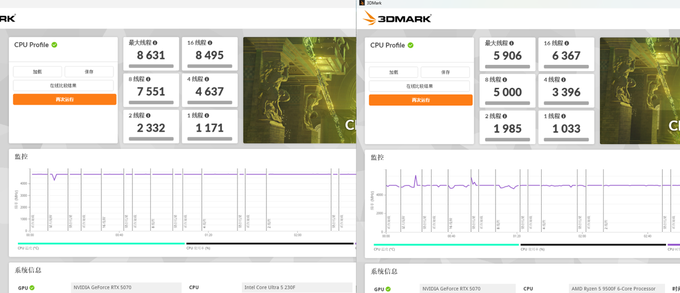 根据参数对比,我们可以看到在CPU基准性能方面,英特尔酷睿Ultra 5 230F于三项测试中均能在一定程度上领先AMD锐龙5 9500F。其中3DMARK CPU Profile的成绩差异最大——英特尔酷睿Ultra 5 230F在最大线程分数方面得到了8631分,而AMD锐龙5 9500F仅有5906。而在CINEBENCH中,英特尔酷睿Ultra 5 230F分别得到2059的单核分数以及17604的多核分数,AMD锐龙5 9500F则分别为1998的单核分数以及15477的多核分数。当然,CPU的实际测试分数并不能完全代表它们辐射到游戏上的优势。
