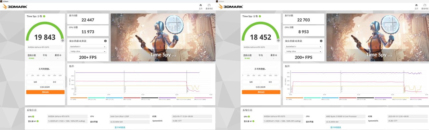 根据测试结果我们可以看到,在3DMARK Time Spy中,英特尔酷睿Ultra 5 230F平台得到了19843的综合分数,AMD锐龙5 9500F得到了18452的综合分数;不过AMD锐龙5 9500F平台的显卡分数达到了22703,较英特尔酷睿Ultra 5 230F平台得到的22447显卡分数微高。