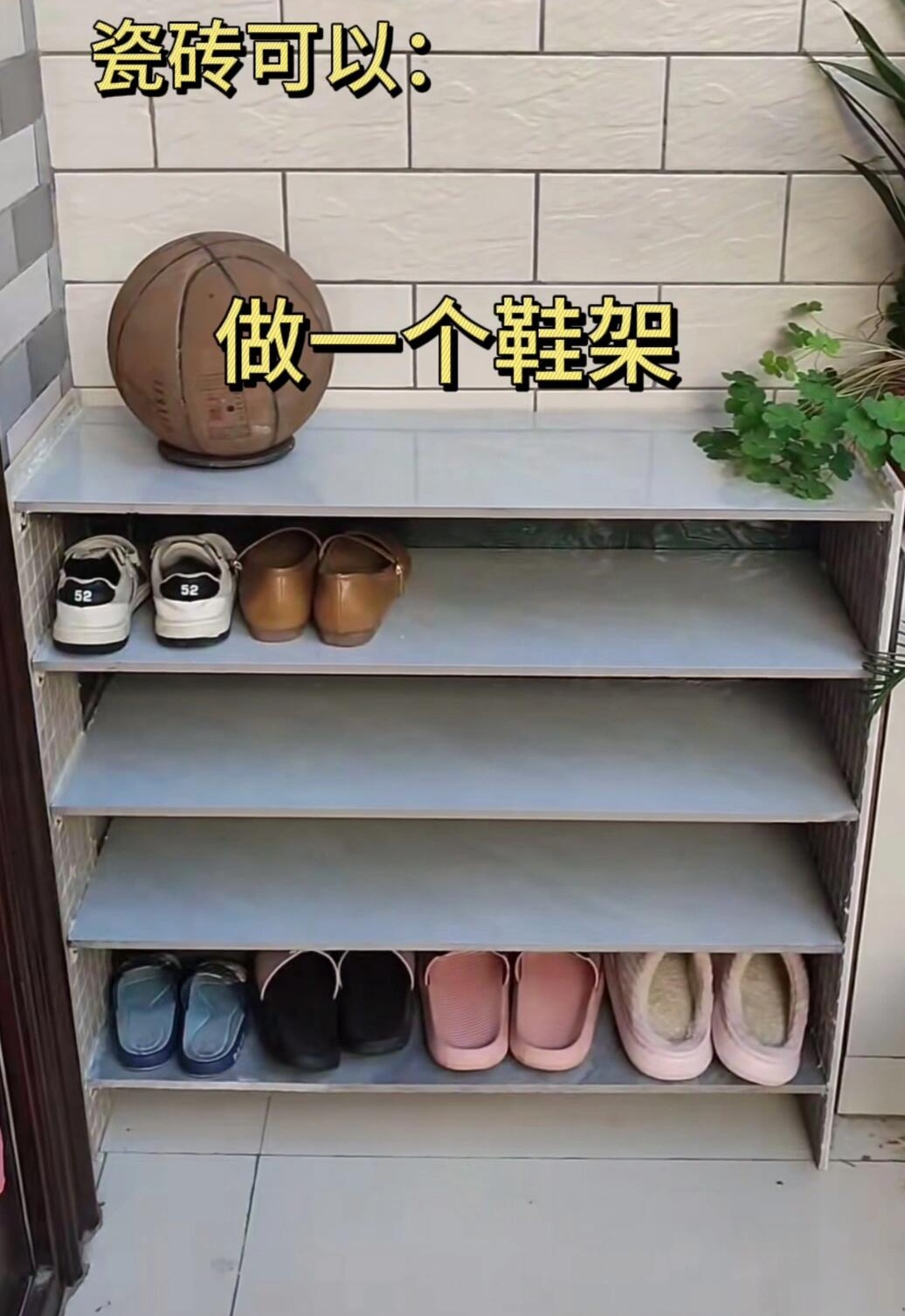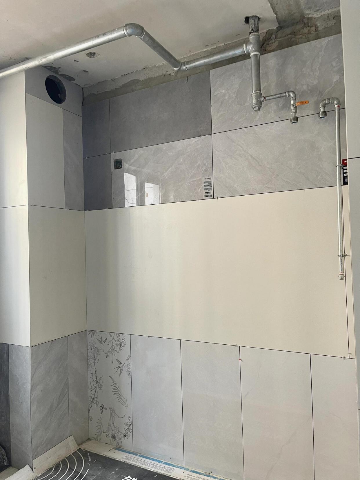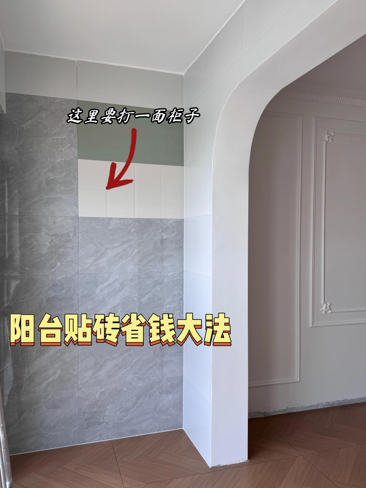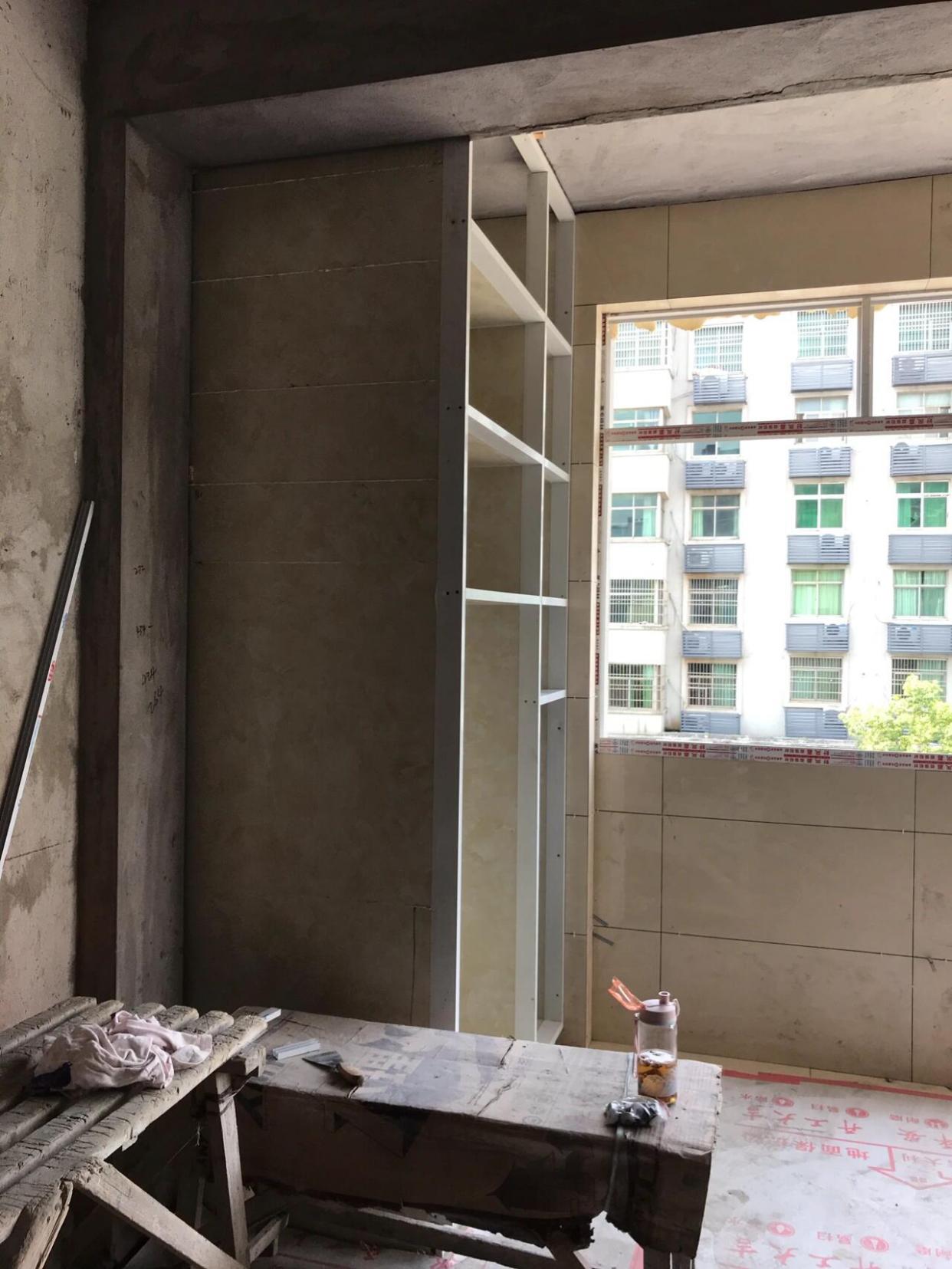 阳台一面墙全部都要定制柜子,于是,家里剩下的瓷砖有用处了,乱七八糟的杂砖贴上去,还不用留缝,后期美缝钱也省了,柜子一装,什么都看不见,真的太香了。