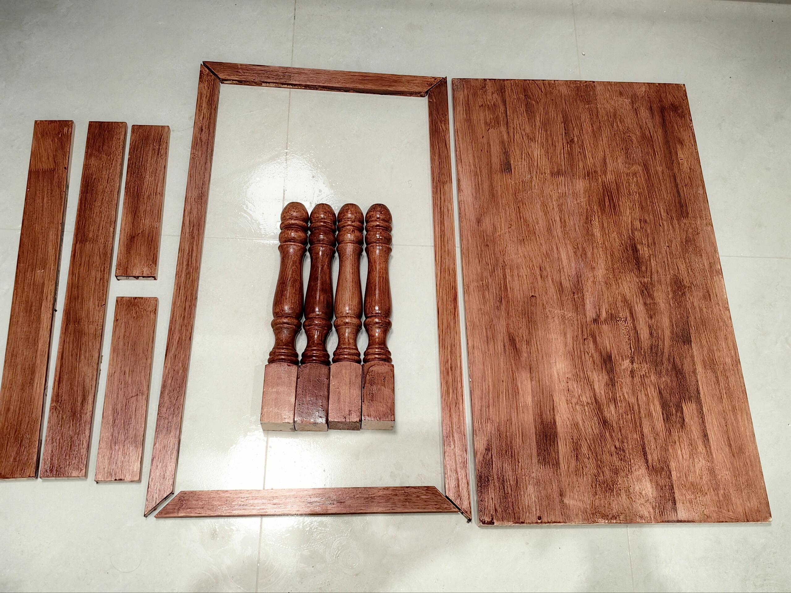 4条桌腿,木工胶(一瓶350ml的一半都没用完),木蜡油,瓷砖胶。