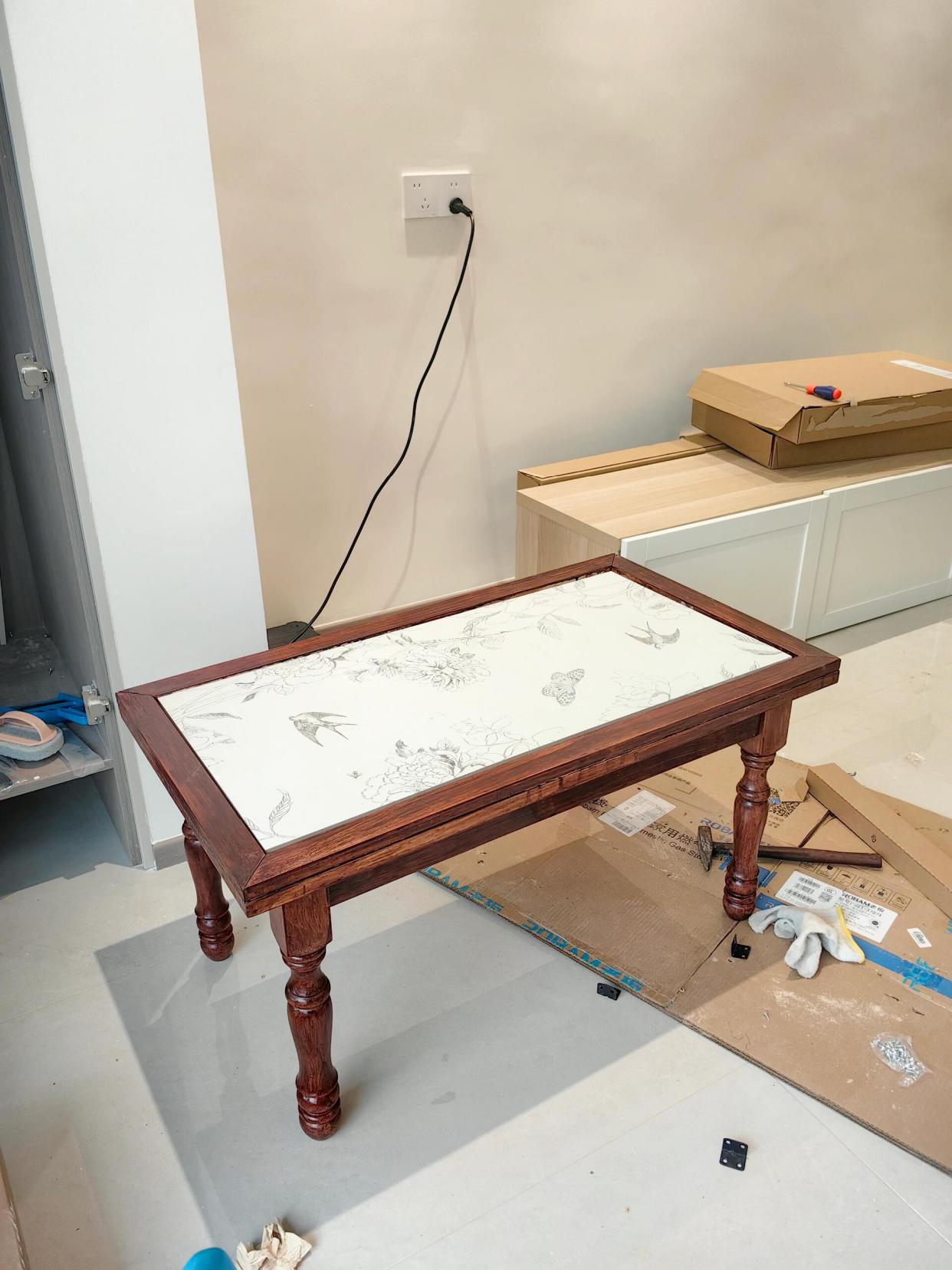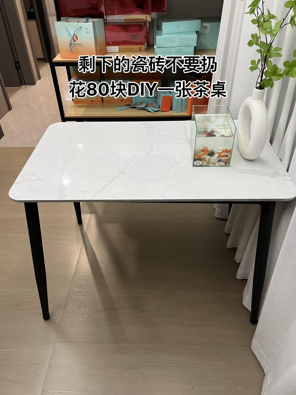 就是用板子和四个边拼成一个桌面,把瓷砖嵌入在里面,再加上4条桌腿,就是一个实用的茶几了。
