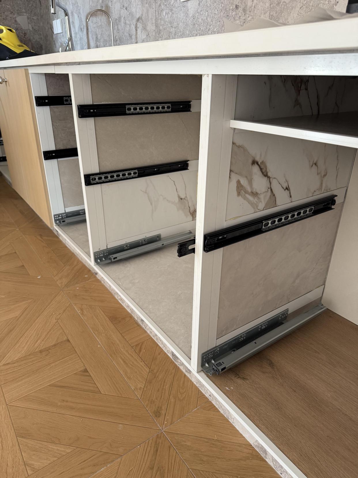 像网友@苹果的家,做的瓷砖橱柜还能安装拉篮,购买尺寸合适的拉篮和轨道后,瓷砖打孔或者用免钉胶固定轨道,拉篮用自带的螺丝拧在轨道上,再放上接水盘就完事了。