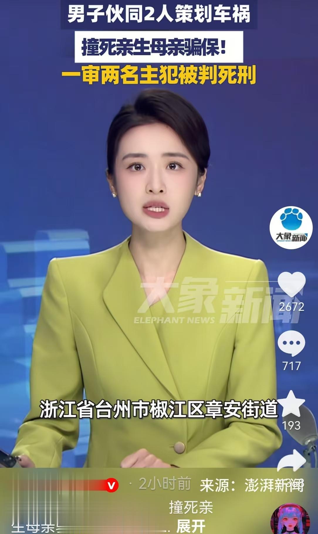 事情发生在去年9月的浙江台州。一开始看起来是场车祸,一个中年妇女被撞死了。可警察一查才发现:开车的、死者的亲儿子、还有另一个同伙,三个人是串通好的!