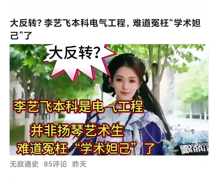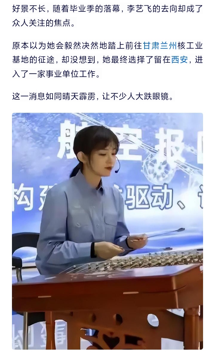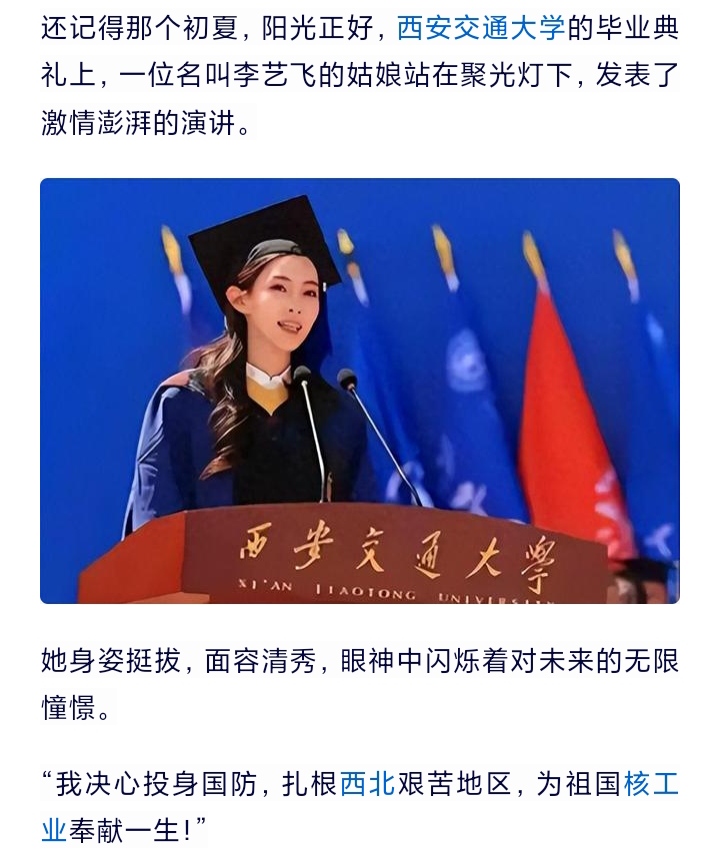 西交核物理专业的硕士生李艺飞,她在毕业时宣誓将驻守边疆投身国防,随后却依靠“靓丽”的在校履历入职西安的某事业编当中。其实这还不算什么,后来又有同校学生说李艺飞是“学术妲己”,靠人情关系混的学历。