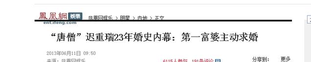 信源:《“唐僧”迟重瑞23年婚史内幕:第一富婆主动求婚》凤凰网 2013年06月11日