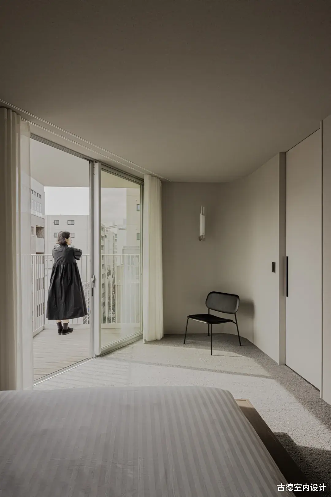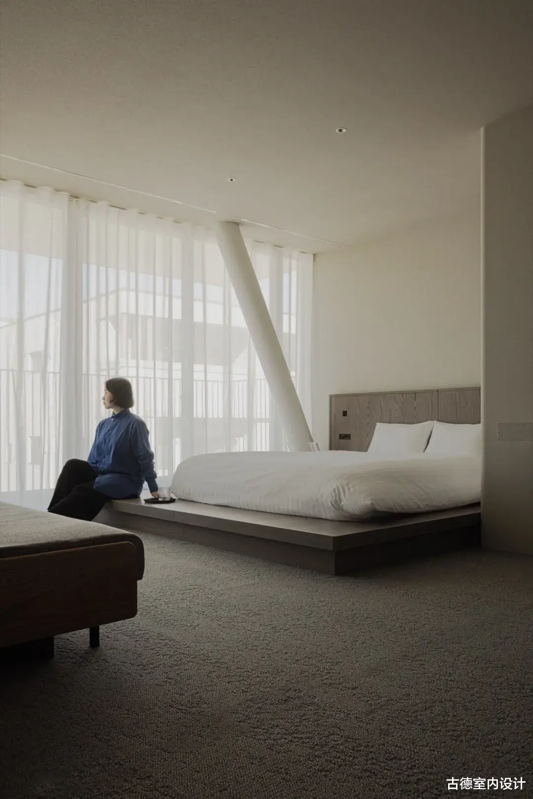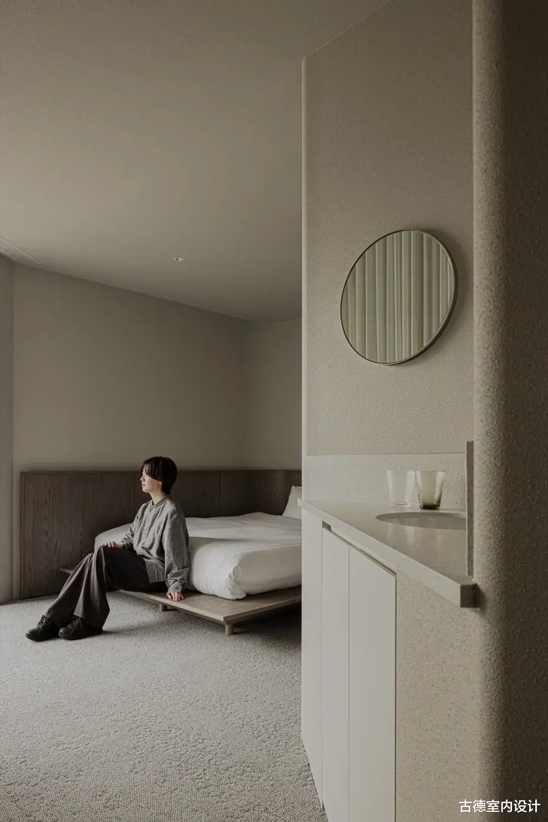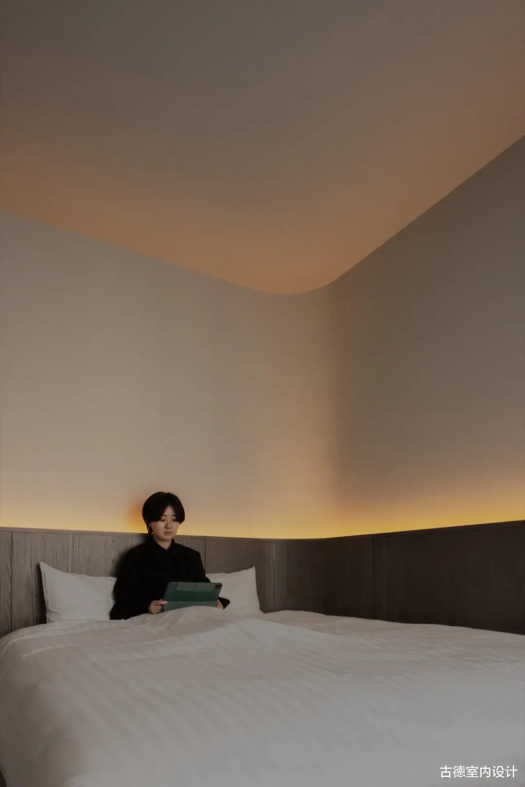 ▲室内_局部 艺术品© Keishin Horikoshi03客房体验客房内部的特点是无缝空间,弯曲的弧形墙壁。我们在墙壁上使用了硅藻土壁纸。硅藻土壁纸的微孔肌理与曲面墙体形成漫反射光环境,让客人在房间感受到柔和的光线,给人一种宽敞的感觉。室内光线充足且舒适,封闭的室内空间与外部直接相连。