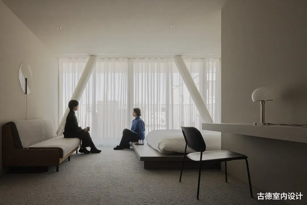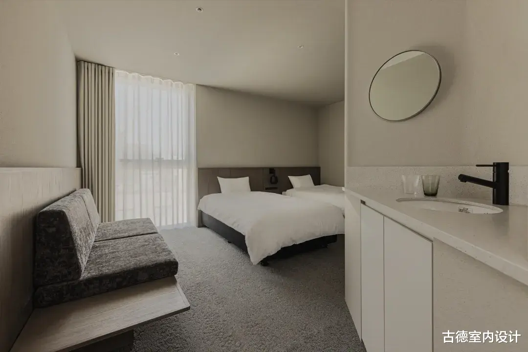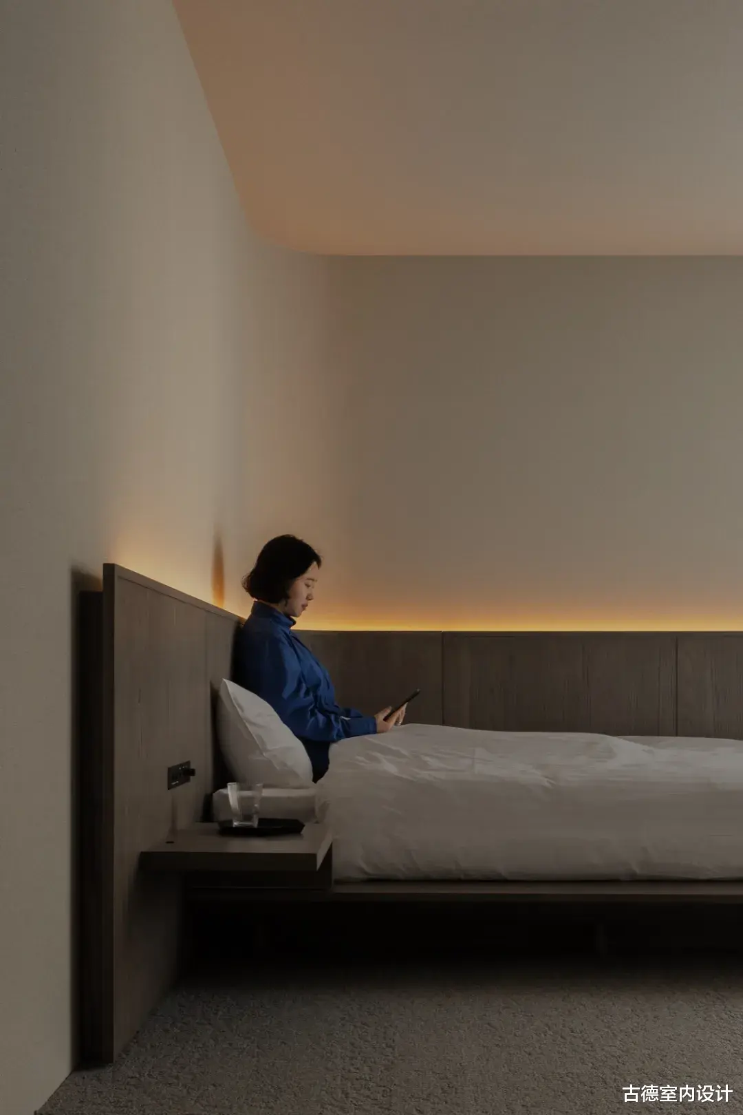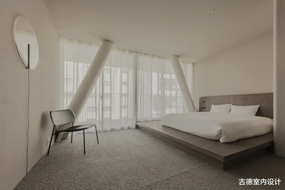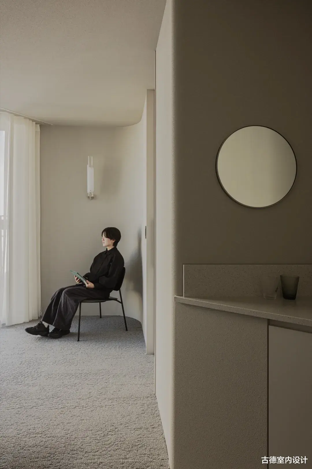▲室内_局部 艺术品© Keishin Horikoshi03客房体验客房内部的特点是无缝空间,弯曲的弧形墙壁。我们在墙壁上使用了硅藻土壁纸。硅藻土壁纸的微孔肌理与曲面墙体形成漫反射光环境,让客人在房间感受到柔和的光线,给人一种宽敞的感觉。室内光线充足且舒适,封闭的室内空间与外部直接相连。