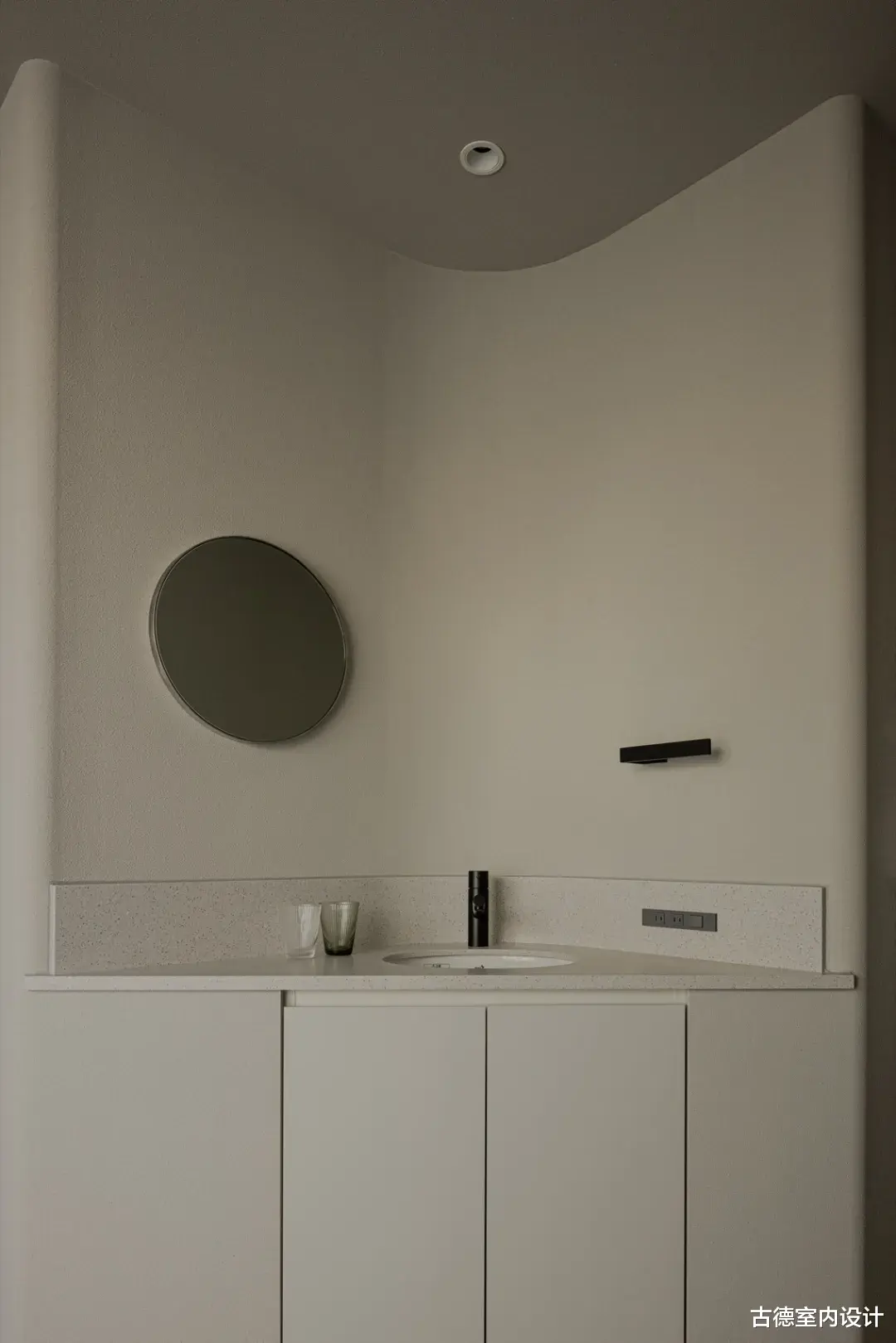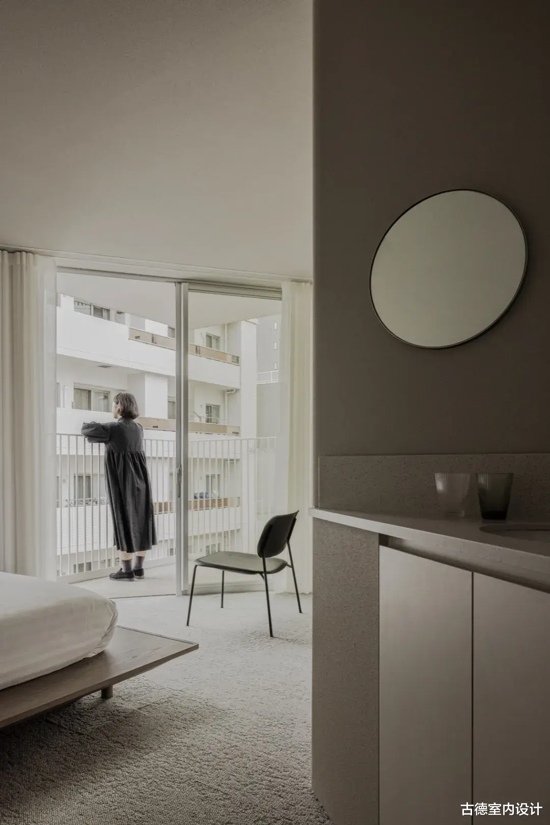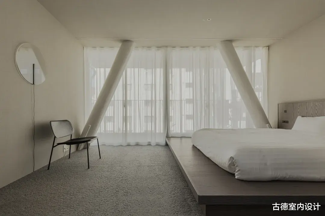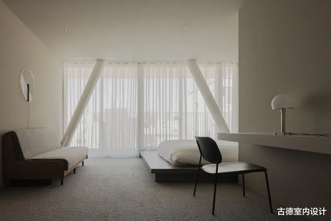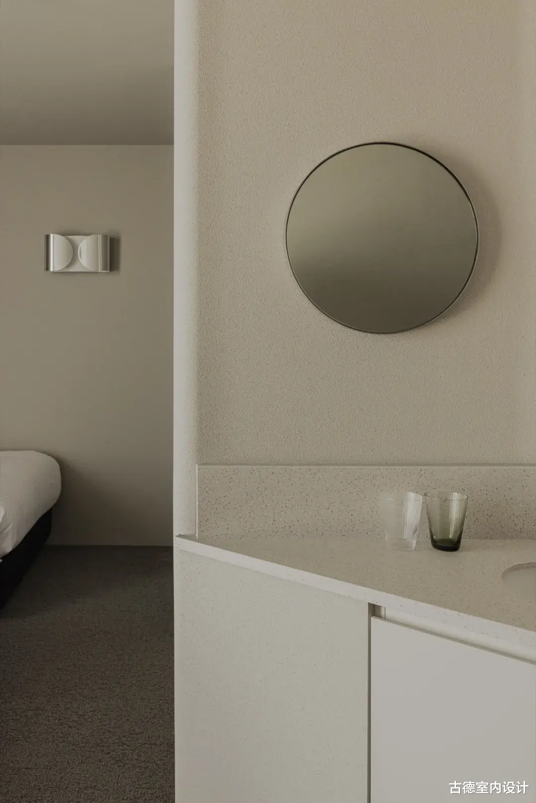 ▲室内_局部 艺术品© Keishin Horikoshi03客房体验客房内部的特点是无缝空间,弯曲的弧形墙壁。我们在墙壁上使用了硅藻土壁纸。硅藻土壁纸的微孔肌理与曲面墙体形成漫反射光环境,让客人在房间感受到柔和的光线,给人一种宽敞的感觉。室内光线充足且舒适,封闭的室内空间与外部直接相连。