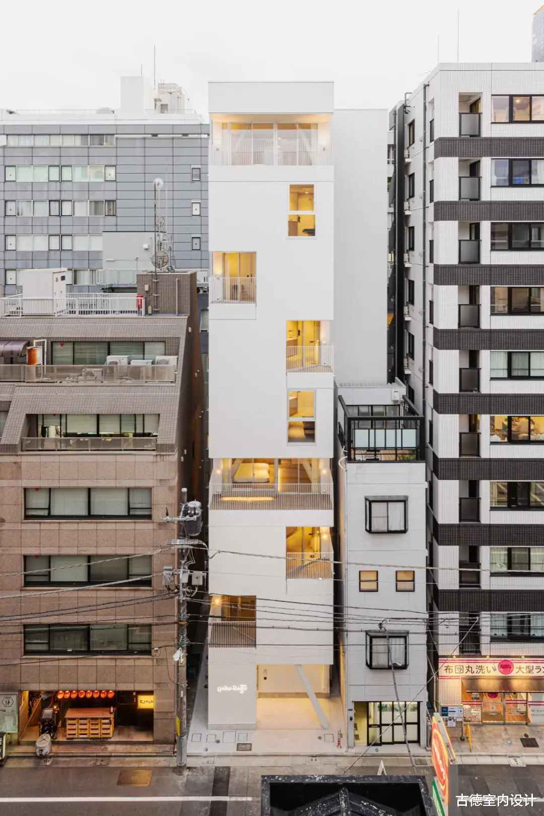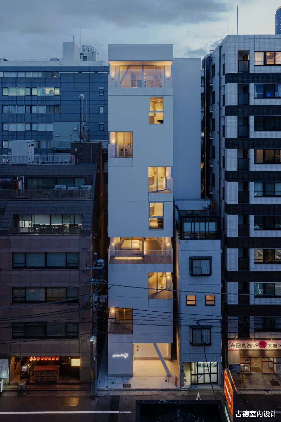 ▲街道主立面© Keishin Horikoshi为了打破“都心狭小用地”这一负面因素,我们关注城市建筑之间的缝隙,并以视线的穿透性为设计主题。在这块仅有 84 ㎡ 的狭小用地上,我们需在有限的空间内打造14间客房。