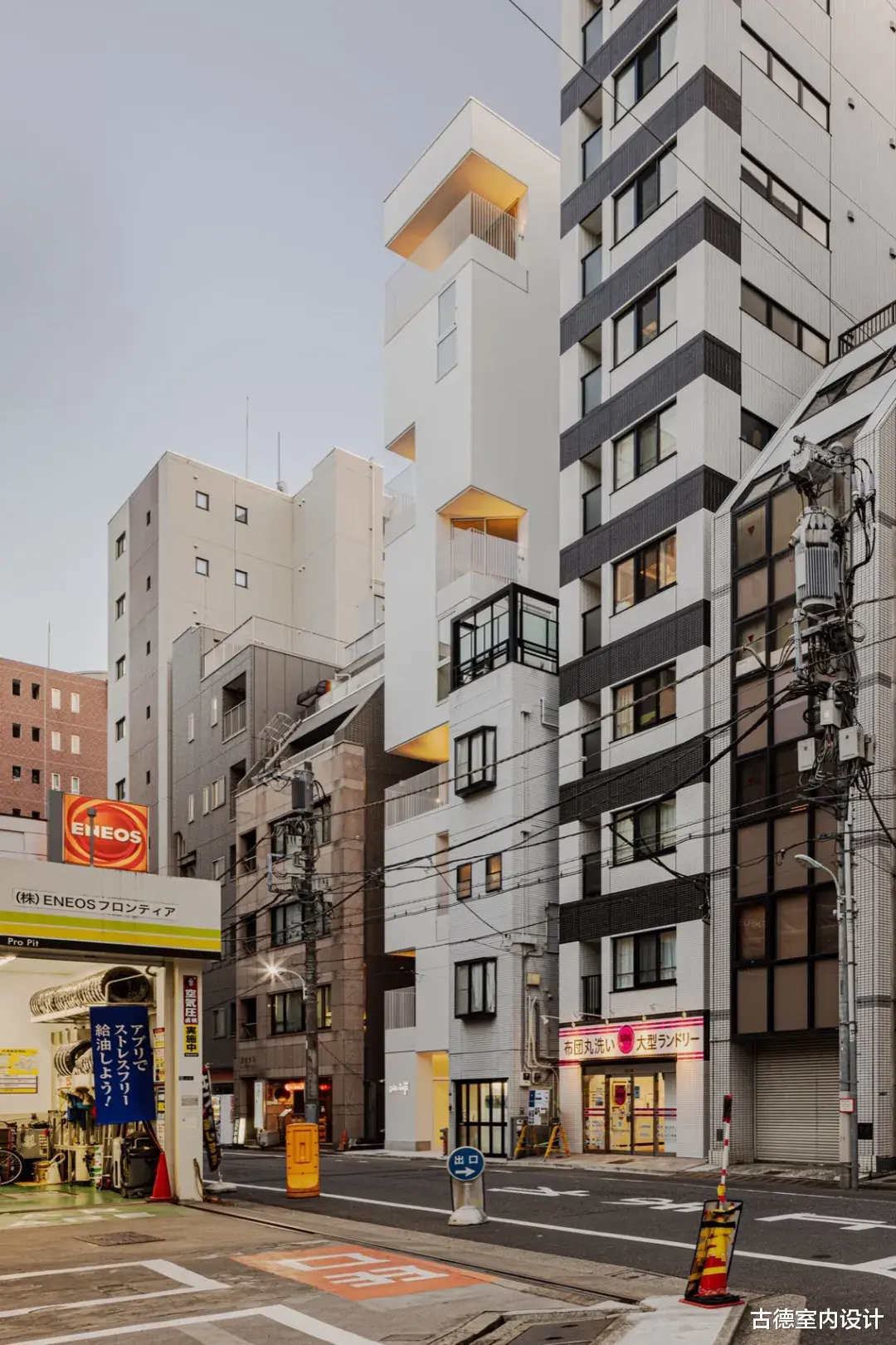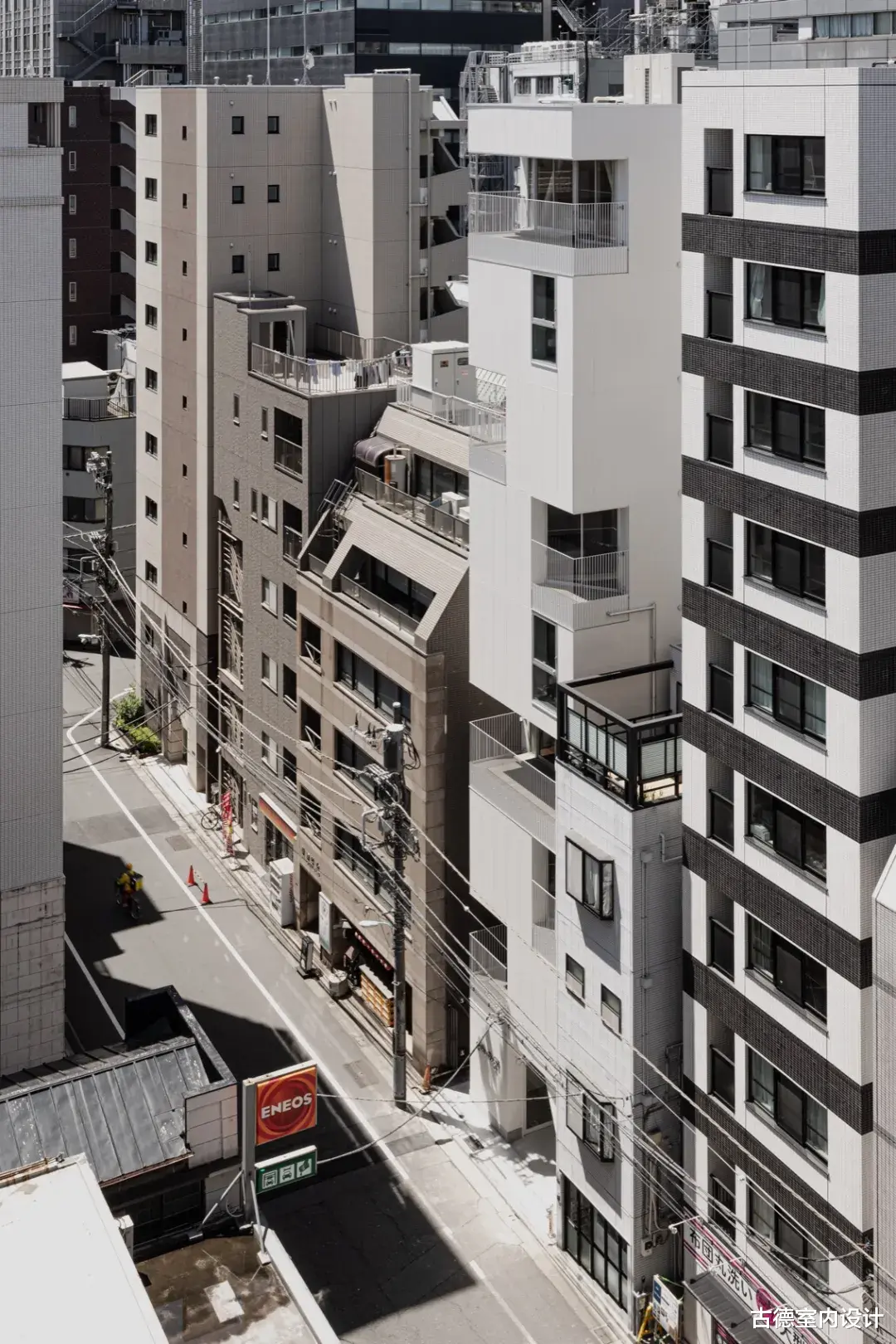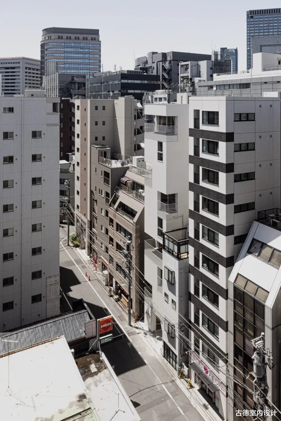 © Keishin Horikoshi立面富有韵律感,每层楼左右两侧的阳台有些雕刻成三角形,有些阳台则覆盖整个开间。为了实现这种形状,我们选择了带斜撑的刚性框架结构,而不是典型的带柱和梁的刚性框架结构。01城市缝隙中的设计项目位于东京日本桥,周围被东京典型的杂居大楼包围。场地没有像景胜地那样的远景视野,且周边建筑在高度、宽度、材质以及开口形式上缺乏统一的设计逻辑。