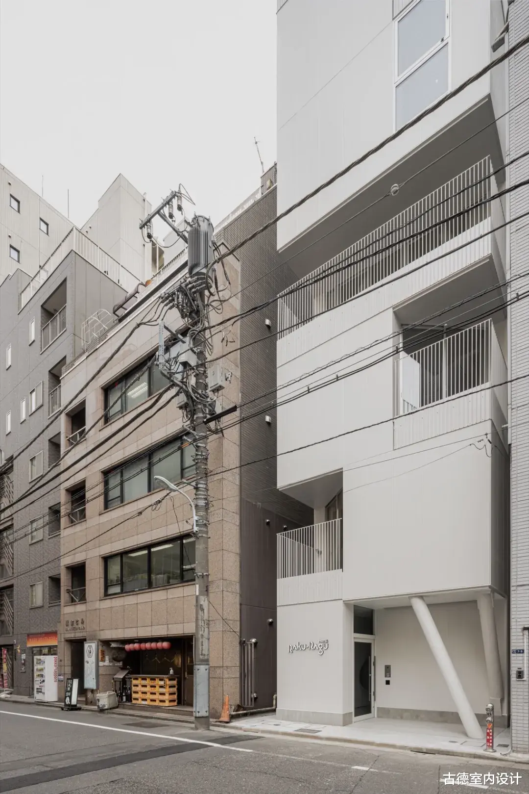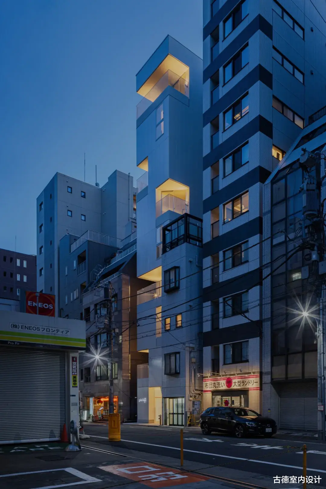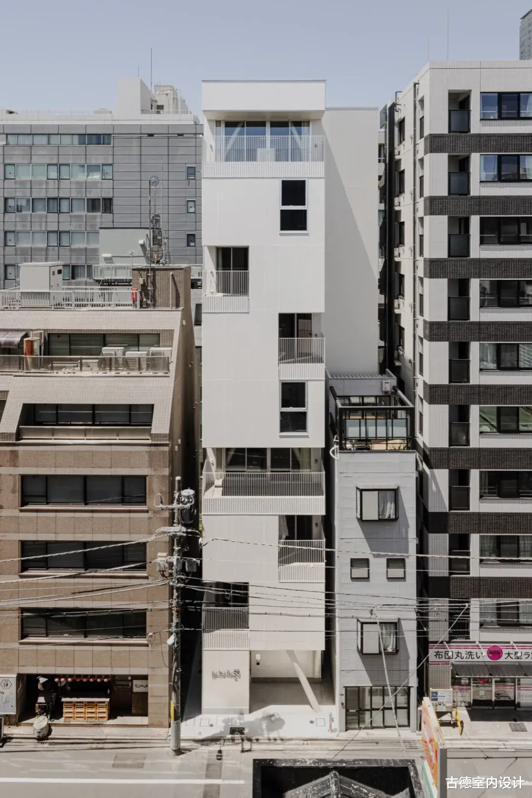 © Keishin Horikoshi立面富有韵律感,每层楼左右两侧的阳台有些雕刻成三角形,有些阳台则覆盖整个开间。为了实现这种形状,我们选择了带斜撑的刚性框架结构,而不是典型的带柱和梁的刚性框架结构。01城市缝隙中的设计项目位于东京日本桥,周围被东京典型的杂居大楼包围。场地没有像景胜地那样的远景视野,且周边建筑在高度、宽度、材质以及开口形式上缺乏统一的设计逻辑。