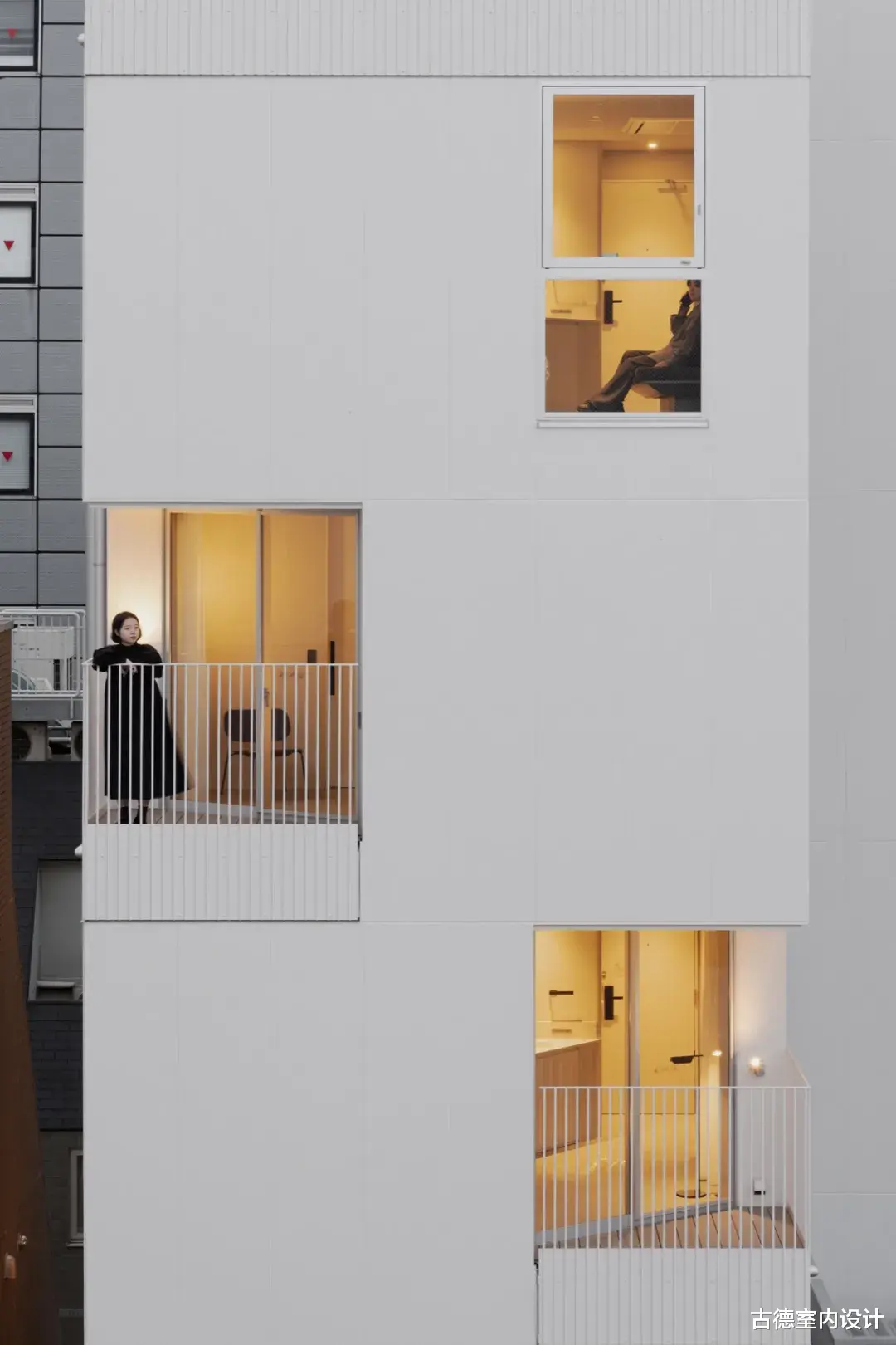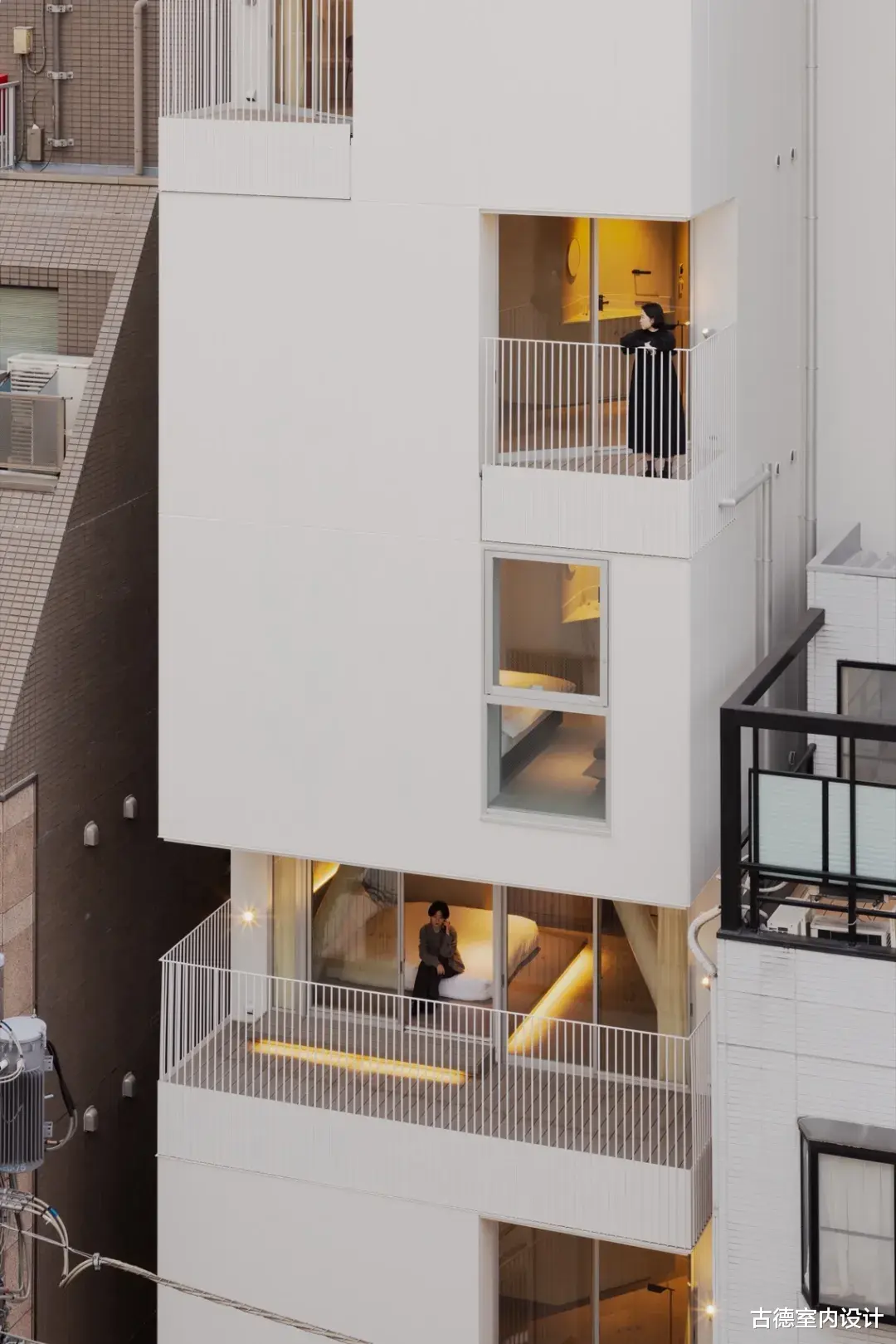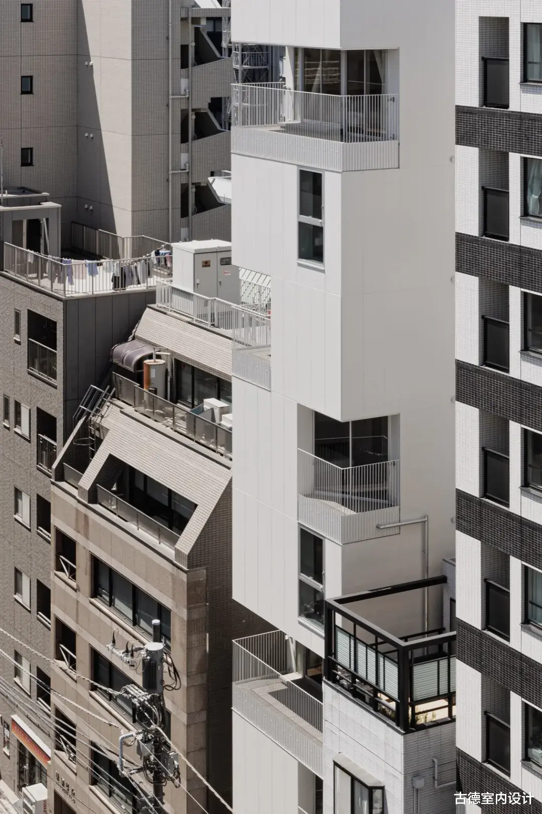 ▲立面局部© Keishin Horikoshi02空间策略阳台该地区周围大多是典型的东京市中心杂居建筑,没有像风景名胜区那样的远景,而且该地区周围的建筑物在高度、宽度、材料或开口方面没有统一的设计规范。在东京的典型城市酒店中,为了最大限度地利用客房空间,通常不会特意设计阳台。客房内,用机械设备营造出稳定的环境。