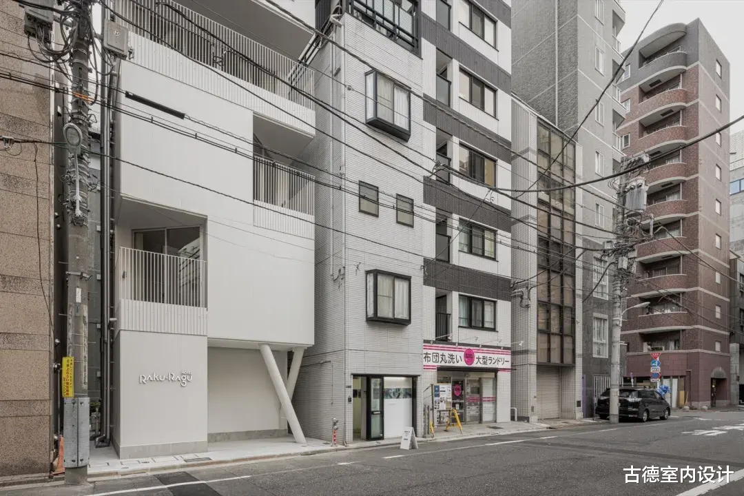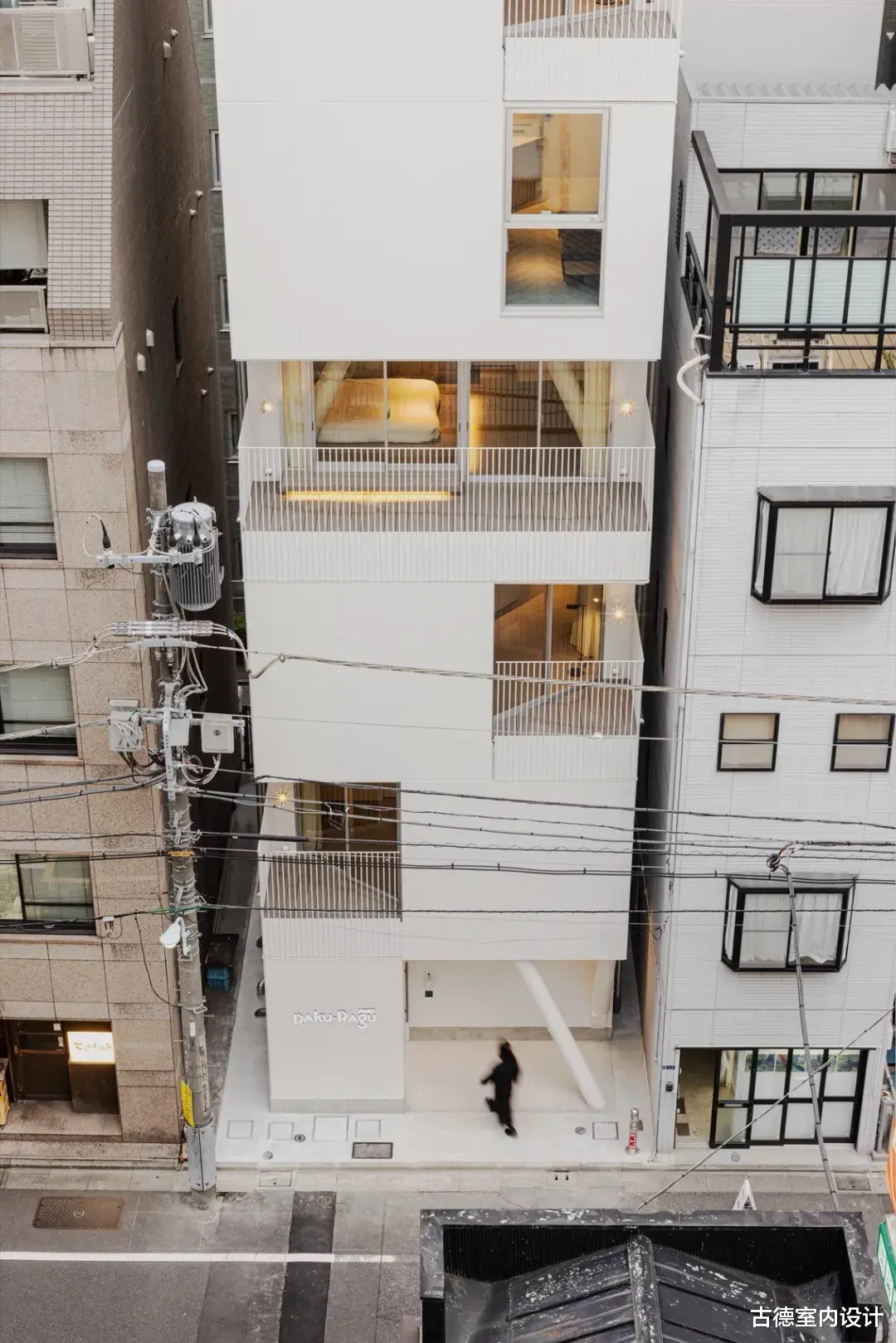 ▲整体 街道视角© Keishin Horikoshi通过观察周围建筑,即使在这个建筑密集的地区,我们也能够找到每个楼层可以轻松地向外开放的方向。每间客房均设有朝向不同方向的阳台,使客人可以从每层楼的每个房间欣赏到不同的景色。最终,Hotel Rakuragu呈现出看起来像是从垂直建筑中随机雕刻出来的独特的外观。
