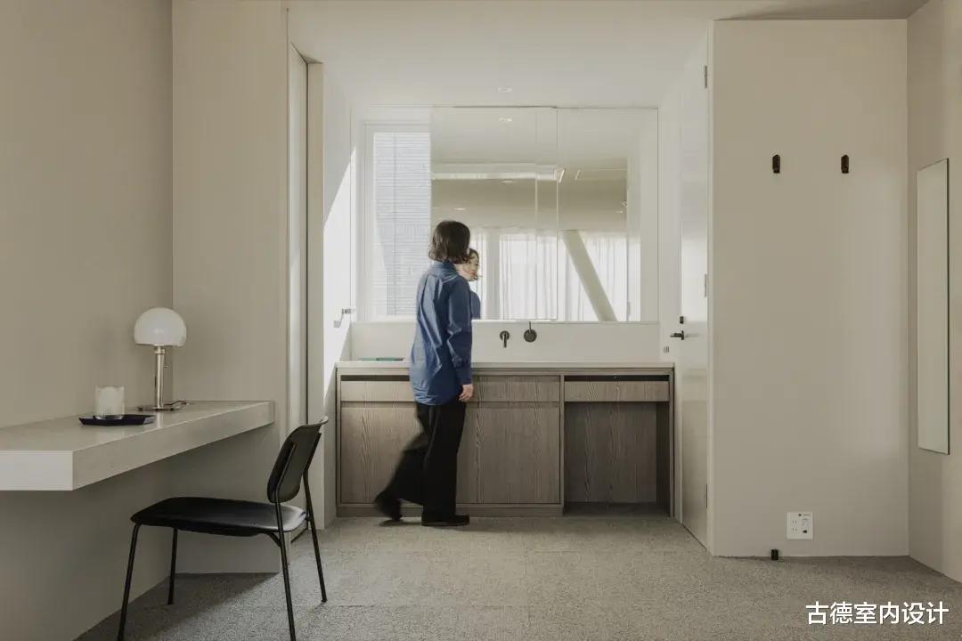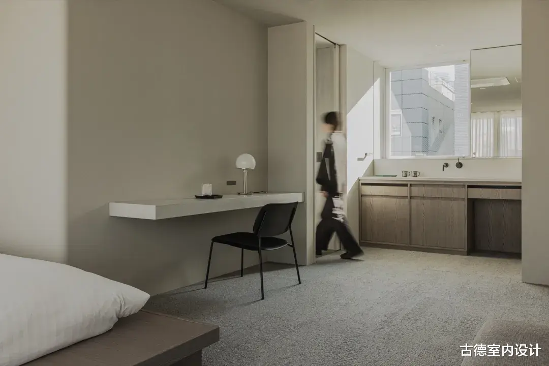 ▲室内_9F客房© Keishin Horikoshi由于浴室在房间中占据了较大的面积,我们认为在设计布局时非常重要,但考虑到日本中央区有很多办公室的情况,有必要考虑确保从外部空间看不到浴缸等。为此,我们决定设计一个新布局,将淋浴间等功能放置在远离开口的区域,反而是将洗脸盆移到外面,以减少幽闭感。提升小尺度空间的心理舒适度,同时确保功能性和设计方面的良好设计。