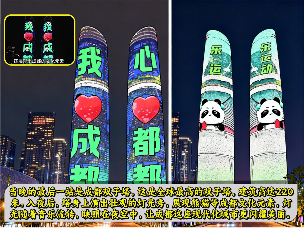 走到安顺桥,古桥的影子落在河面上,跟远处的现代建筑融合在一块儿,感觉有种美妙和神奇的和谐感觉。最让她惊艳的是双子塔,220米高的楼,一亮起灯光秀,传统文化、还有熊猫的图案在大楼墙面上流来流去,让她惊艳不已。