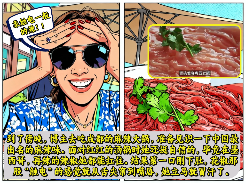 博主咬第一口的时候,那股发酵的香味在嘴里散开,跟墨西哥街头的玉米饼完全不一样,但都是让她觉得美味的食物。到了傍晚,她去吃成都的麻辣火锅,准备见识一下中国最出名的麻辣味。红红的汤锅端上来的时候,她还挺自信的,毕竟在墨西哥,再辣的辣椒她都能扛住。