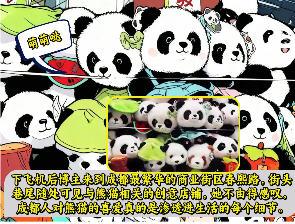 出发前也有朋友跟她开玩笑,说成都的熊猫满大街都是,她当时认为是开玩笑。结果飞机一落地,果然到处都能看到熊猫造型的装饰或者画,这才发现朋友没骗她,果然满大街都是熊猫。