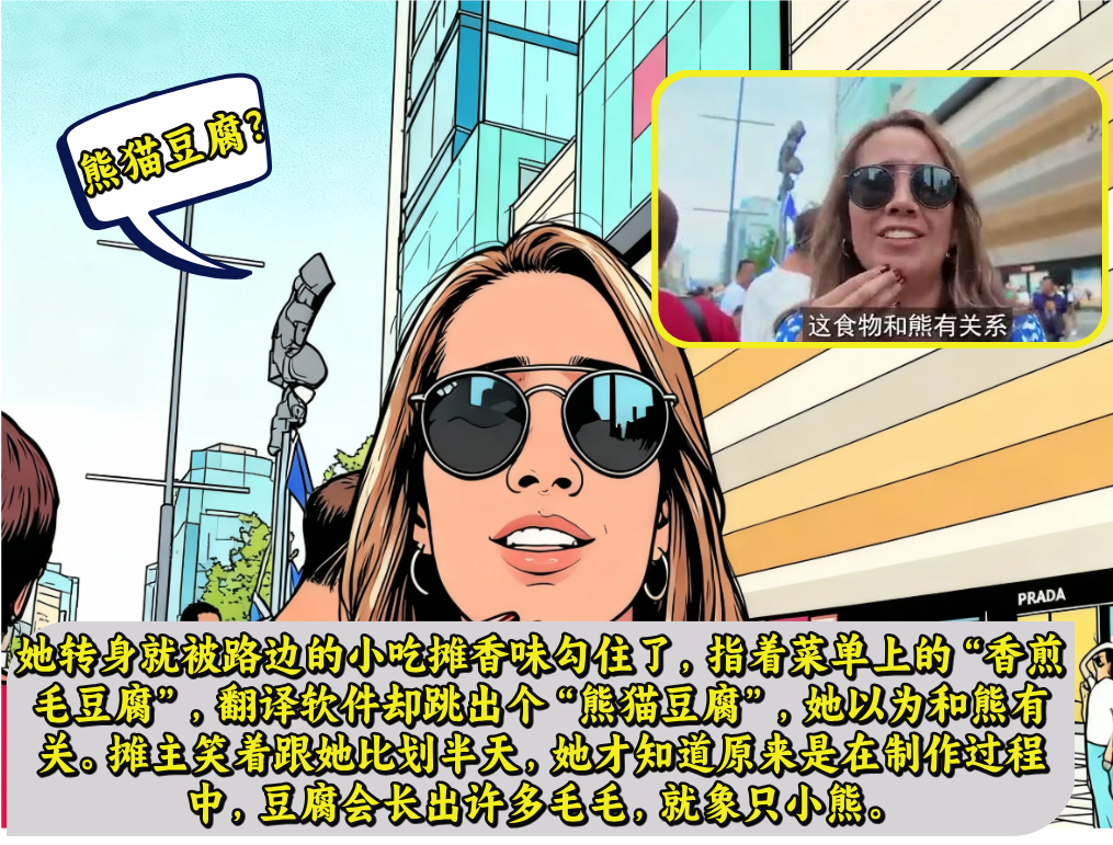 她第一站直接奔春熙路去了,街头IFS楼上爬着的那只熊猫雕塑,周围全是拍照的游客,她也挤进去拍了几张。转身就被路边的小吃摊香味勾住了,指着菜单上的“香煎毛豆腐”,翻译软件却跳出个“熊猫豆腐”,她以为和熊有关。摊主笑着跟她比划半天,她才知道原来是在制作过程中,豆腐会长出许多毛毛,就像只小熊。