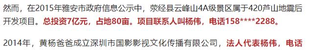 他声称耳环是仿品,结果被网友挖出2015年雅安市政府公示的灾后重建项目中,荥经县云峰山景区的联系人正是杨伟,电话也和他注册公司时留的一模一样。