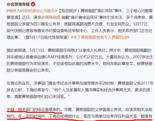 官媒《北京青年报》直接开怼:毕竟,黄杨钿甜的父亲曾是公务员,应该受相关法规约定。