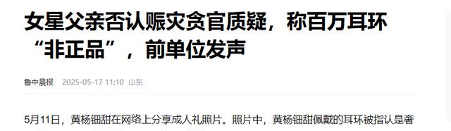 女星父亲否认赈灾贪官质疑,称百万耳环“非正品”,前单位发声