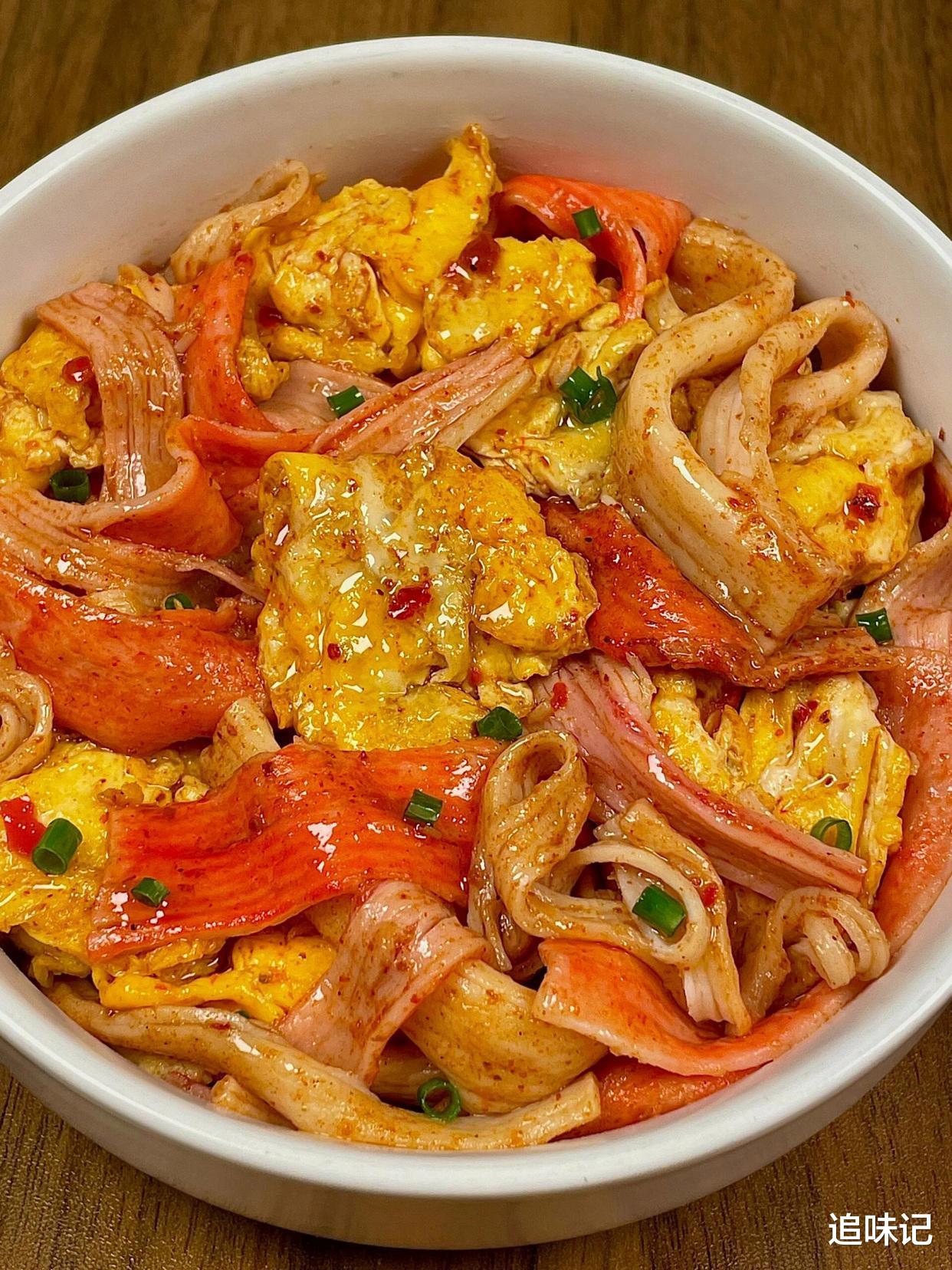 蟹柳炒鸡蛋鸡蛋嫩滑得像豆腐,蟹柳鲜香有嚼劲,酱汁浓郁微辣,咸甜适中,每一口都让人停不下来,简直是下饭神器!