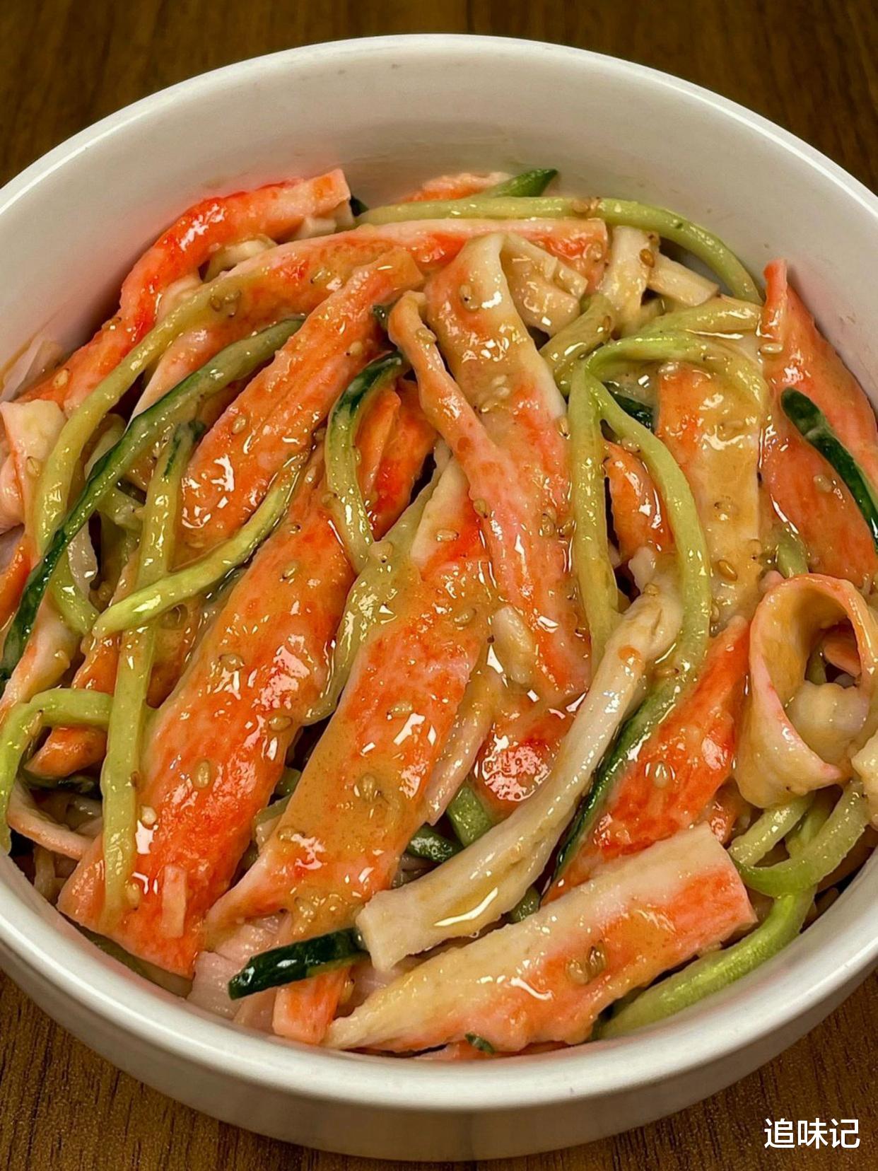 黄瓜拌蟹柳蟹柳鲜嫩,黄瓜爽脆,芝麻酱的香气浓郁,酸甜适中,清爽不油腻,每一口都带着芝麻的香气,特别适合夏天!
