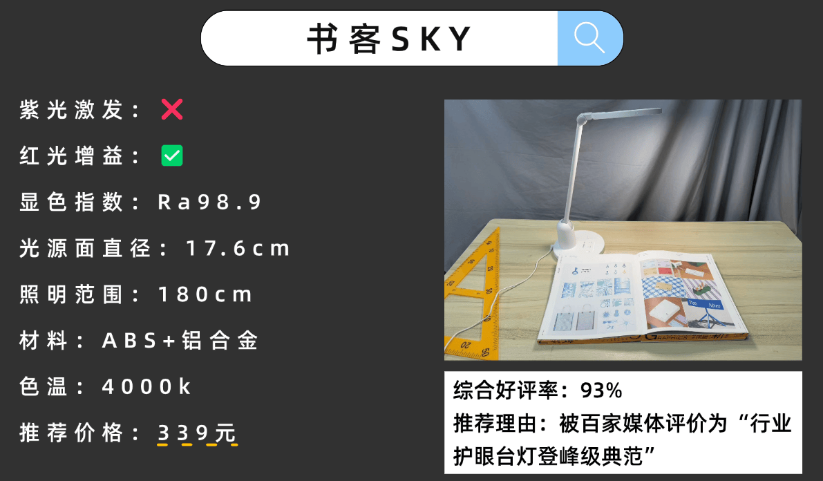 为了给青少年打造真正舒适、健康的用眼环境,SUKER书客可谓是倾尽心血。它不仅将国AA照明标准作为sky的最基础底线,全面超越高达115%,还把显色指数拉到几乎天花板的Ra98.9;搭载全新一代PLP光电处理器,耐用性能较上代提升146%,长时间使用依旧光质稳定如初;严格符合RG0无蓝光危害标准,并实现真正意义上的无可视频闪,更贴心的是,它配备超高角度自由调节、30秒、45分钟、60分钟定时休息模式等多项功能,轻松适配不同学习与阅读场景。难怪有知名母婴媒体盛赞它为“百元护眼台灯的性价比天花板”,称得上是家长和学生的护眼首选。
