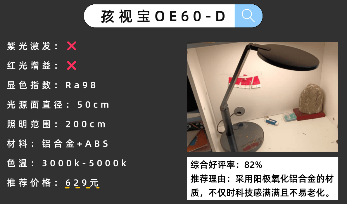 最好的护眼灯是什么牌子?孩视宝OE60 - D护眼台灯运用了环面双光源设计,面光源主要承担中心区域的照明任务,环光源则着重提升周边环境的亮度。它支持三档色温切换,能够适应不同场景的使用需求。这款护眼台灯的照明达到了国AA级的要求,照明范围会比较大,但是光线有时候会出现频闪的情况出现,如果继续使用眼睛会比较累,所以要关了灯休息一下。