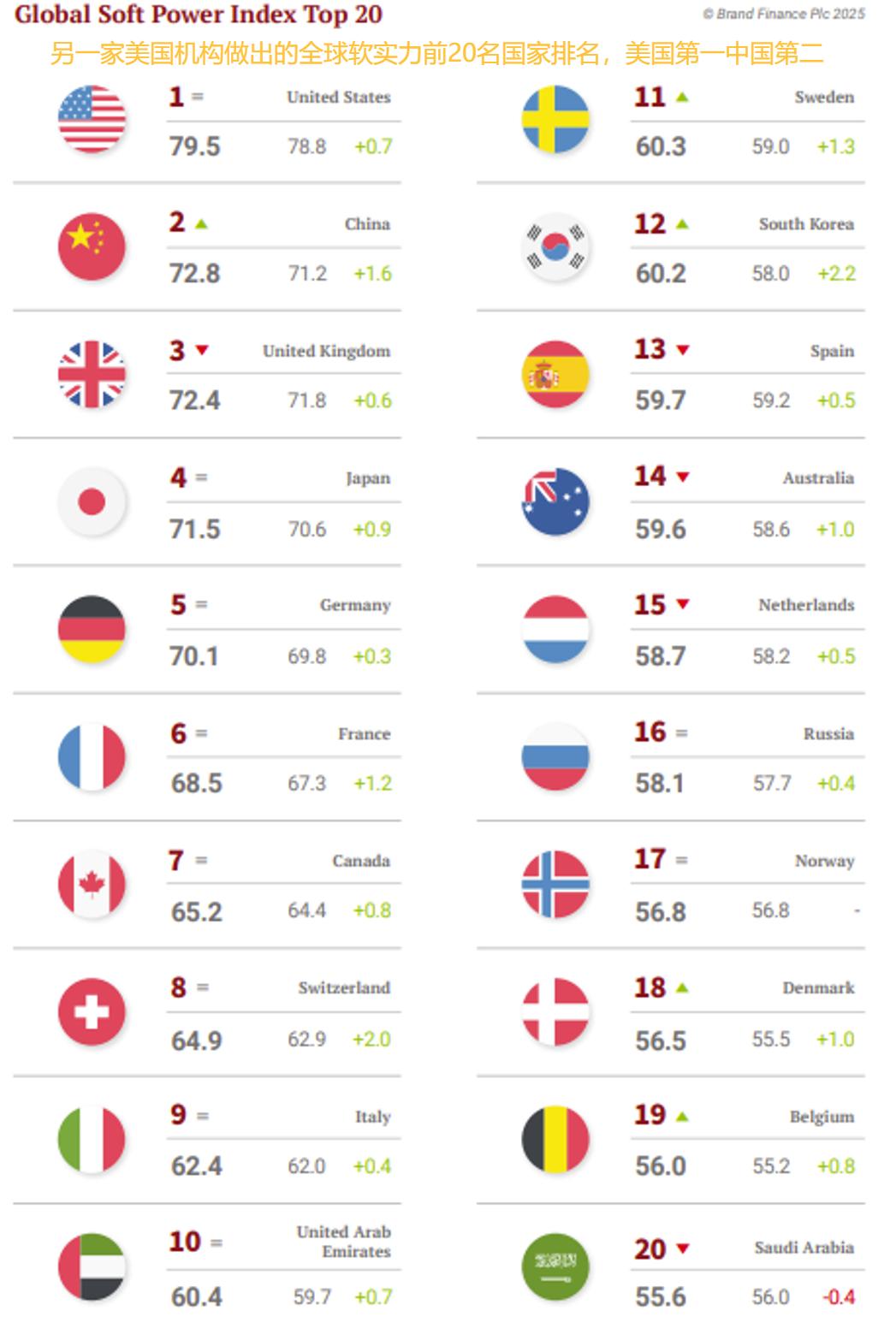 整体来看,这一结果与其他调查机构的发布的结果相同:在全球范围内的软实力排名,美国排第一,中国排第二,超过其他所有国家。