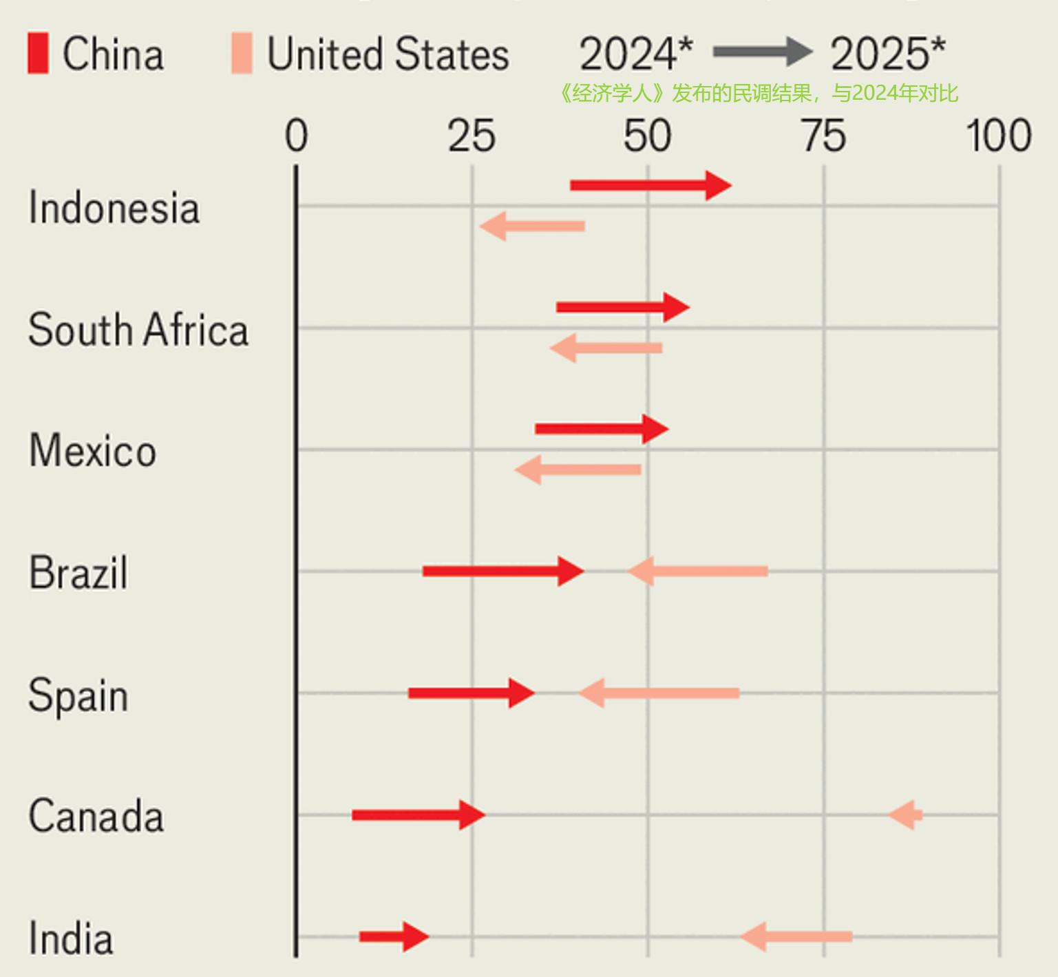 拉丁美洲和欧洲的地区的增长最大:在巴西、加拿大、墨西哥、南非和西班牙,对中国的偏好上升了约20个百分点,对美国的支持率都下降了。