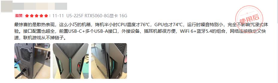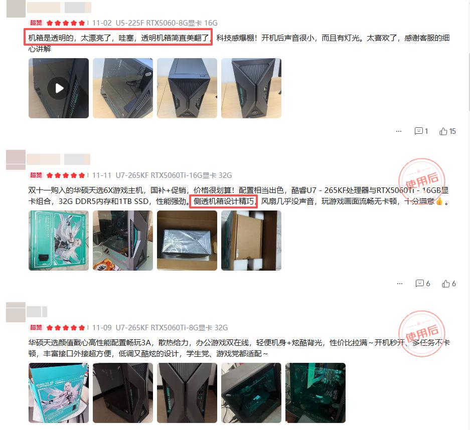 从用户评价中也能看出华硕天选6X的性能表现确实有一手,优秀的散热表现,玩游戏、剪辑基本无压力,而且运行的噪音也小,说是六边形战士都不过分!!