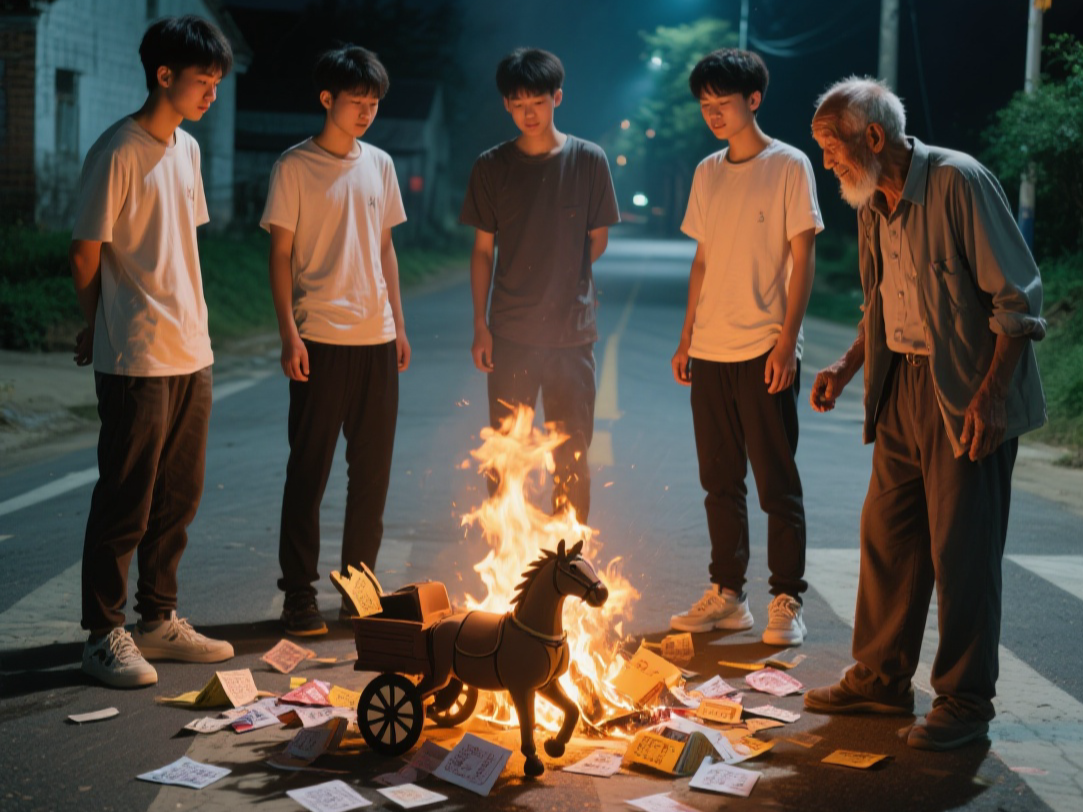 “建国,听说了吗?王老六他爹昨儿夜里走了,孝子贤孙们明天一早要去十字路口‘烧车马’。”邻居老张头隔着矮墙喊道。