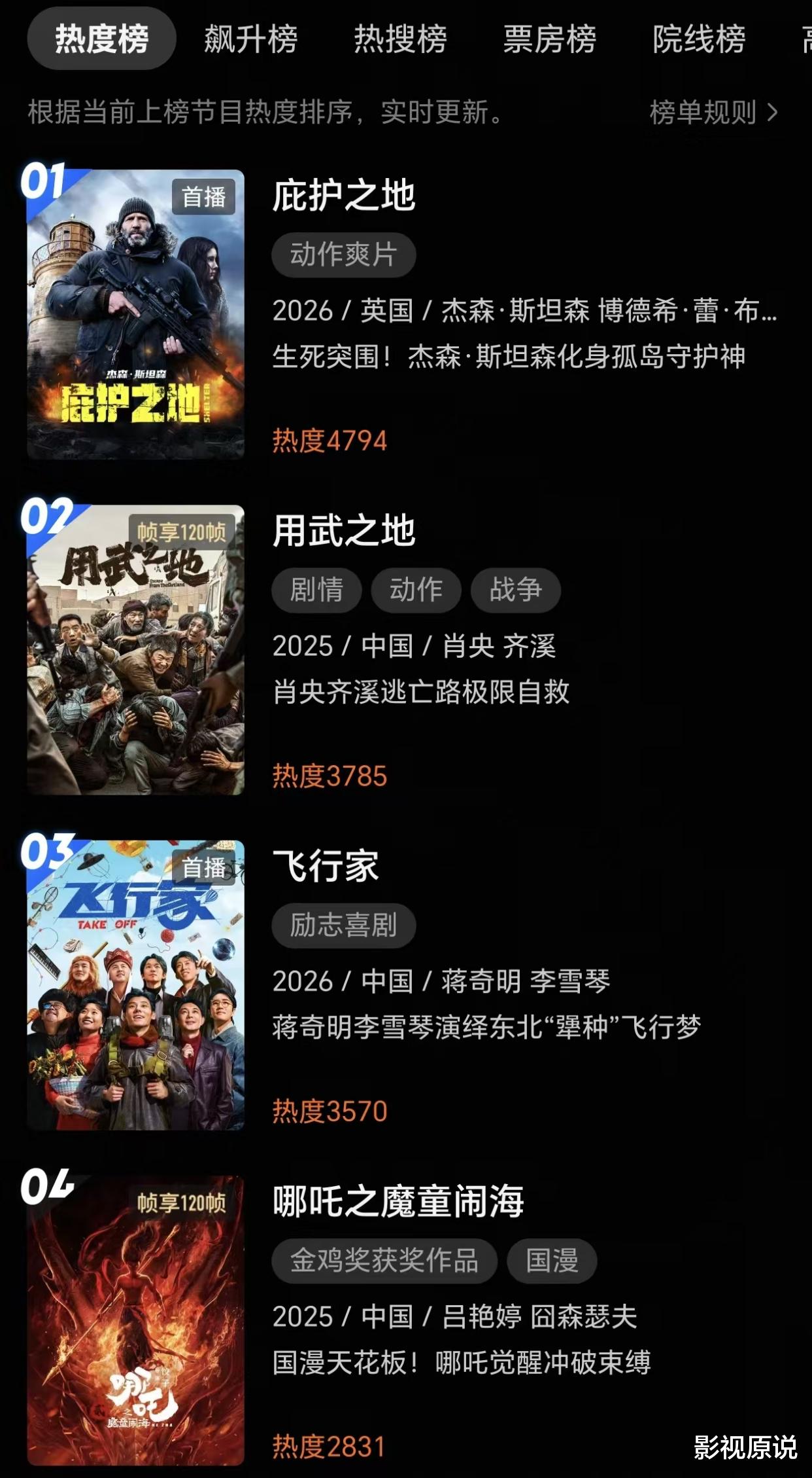 前不久,《庇护之地》开始在国内的线上视频平台播出,它第一时间就以超5000的热度值,力压《用武之地》《飞行家》和《哪吒2》等一众高关注度的国产片,拿下了热度榜冠军。