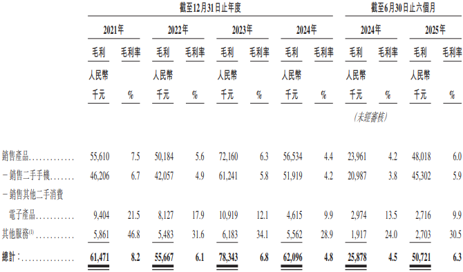 报告期内,公司的毛利率分别约为8.2%、6.1%、6.8%、4.8%、6.3%。而同行万物新生(爱回收),于2021年至2024年的毛利率分别为26.28%、23.03%、20.26%及19.85%,约为闪回科技的4倍。