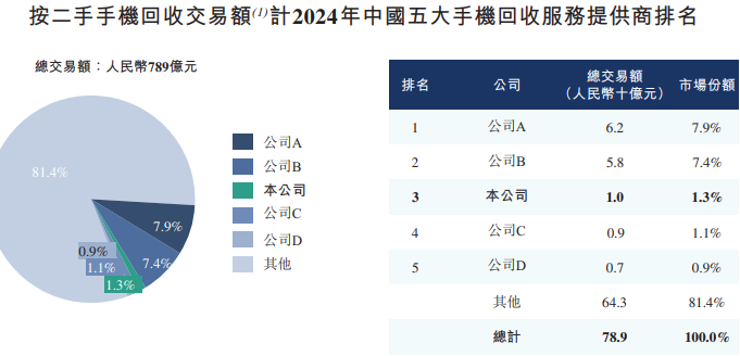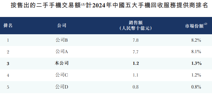 据弗若斯特沙利文统计,按2024年回收及售出的二手手机交易总额计算,闪回科技是中国第三大手机回收服务提供商,市场份额分别约为1.3%及1.3%,远低于行业老大(7.9%、8.1%)、老二(7.4%、8.2%)。