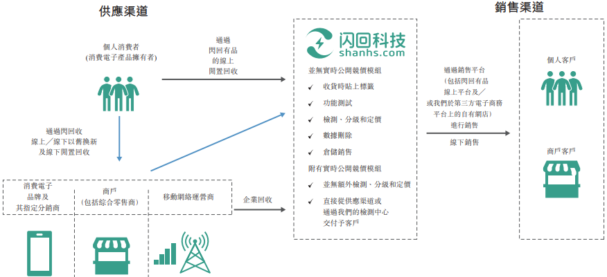 通过回收系统“闪回收”,公司左手对接品牌、平台和渠道,右手面向个人消费者,通过“以旧换新”模式和小米、三星、华为、荣耀、Vivo、京东、闲鱼等合作,低价回收旧手机后进行翻新,再通过其线上平台“闪回有品”及自有网店进行转售。