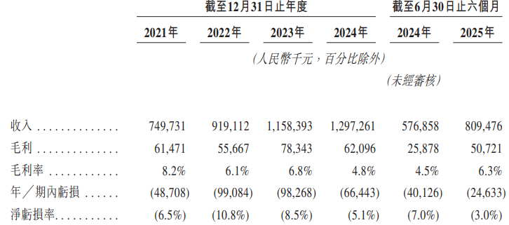 2021年至2024年及2025年前6月(报告期内),公司分别录得营收7.50亿元、9.19亿元、11.58亿元、12.97亿元、8.09亿元;期内亏损分别为4870.8万元、9908.4万元、9826.8万元、6644.3万元、2463.3万元,累计亏损约3.37亿元。