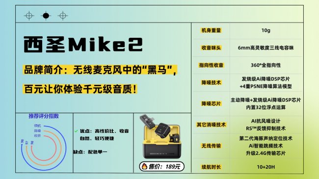 一直以来,无线领夹麦都绕不开“低价音质差,高价才靠谱”的怪圈,想录得清晰就得花上千元。西圣Mike2直接打破这个僵局,不到200元的价格,把千元级配置塞进机身,成为日常创作的性价比天花板。